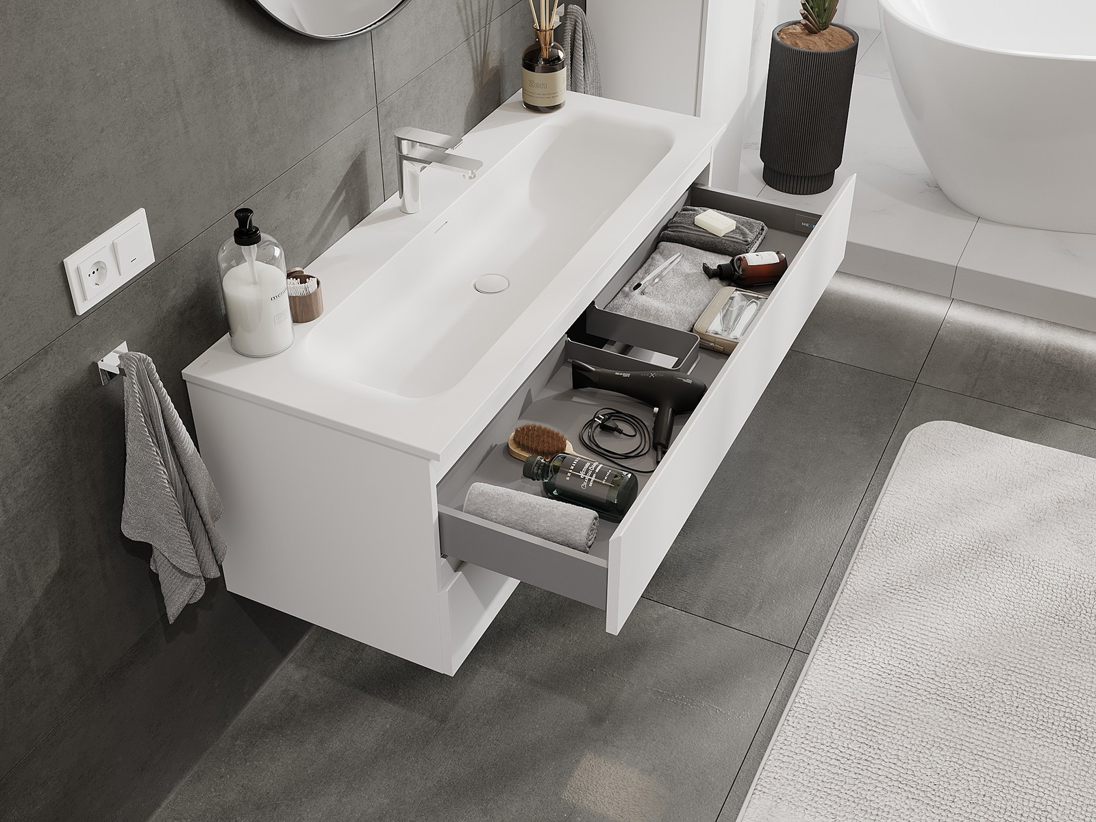 Our modular bathroom furniture can be combined in various colour configurations, allowing for complete personalisation. You can choose both the appearance and functions of individual elements, enabling you to adapt the furniture to your own stylistic and functional preferences.