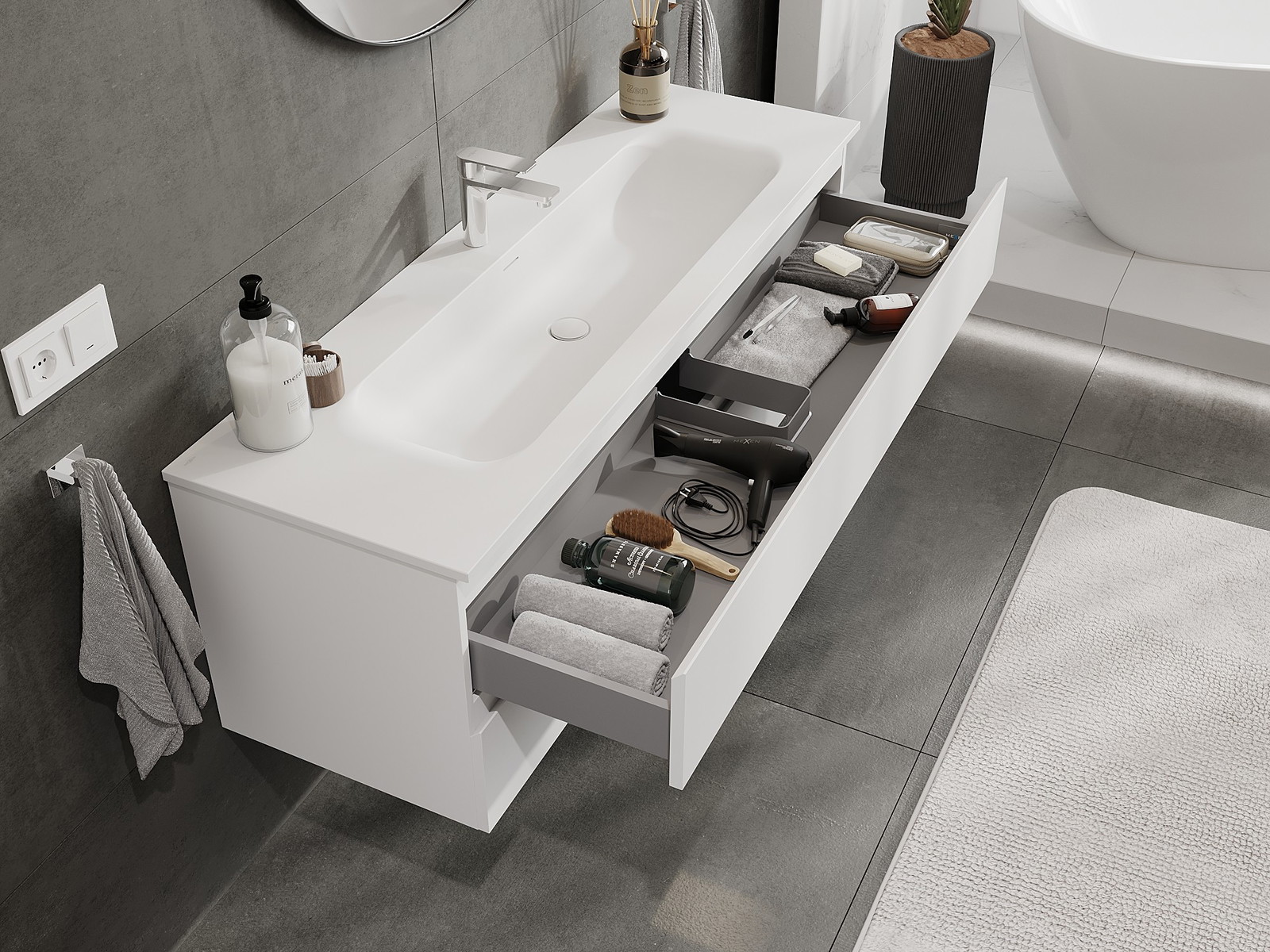 Our modular bathroom furniture can be combined in various colour configurations, allowing for complete personalisation. You can choose both the appearance and functions of individual elements, enabling you to adapt the furniture to your own stylistic and functional preferences.