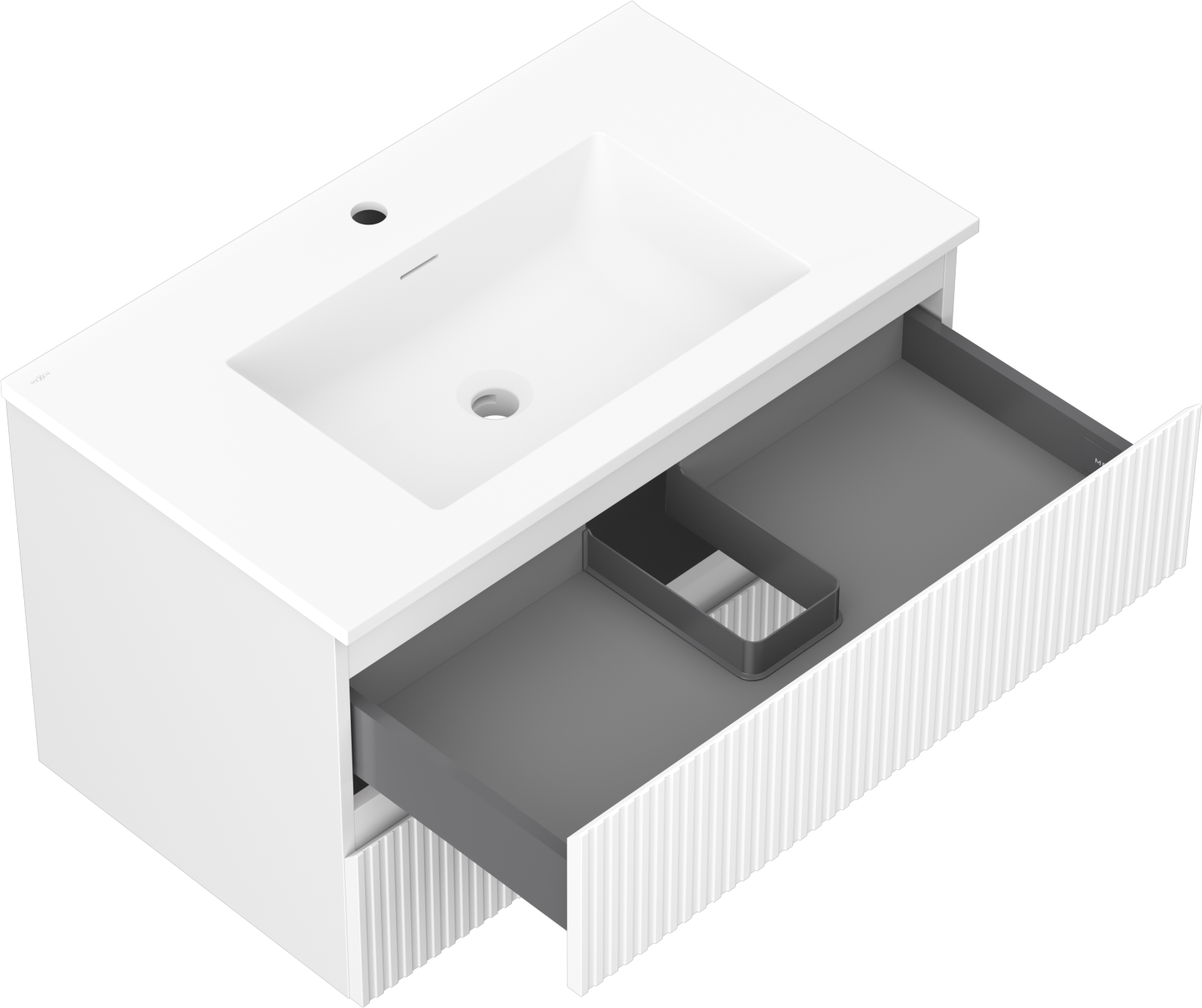 The cutout in the drawer is designed in such a way as to accommodate the siphon, which is essential in sink installations. This allows the furniture to be fully functional without having to give up drawer space for the installation.