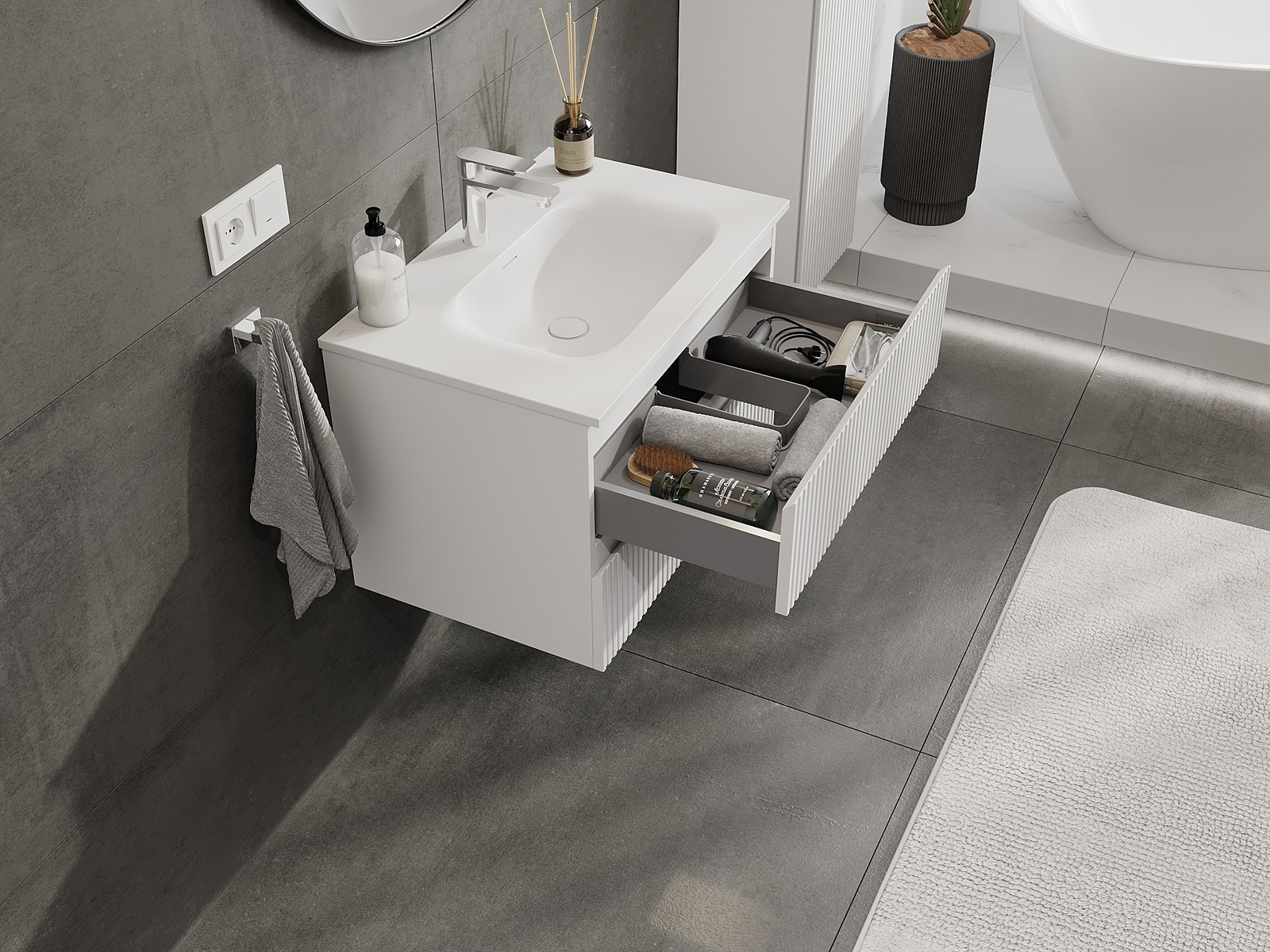 Our modular bathroom furniture can be combined in various colour configurations, allowing for complete personalisation. You can choose both the appearance and functions of individual elements, enabling you to adapt the furniture to your own stylistic and functional preferences.