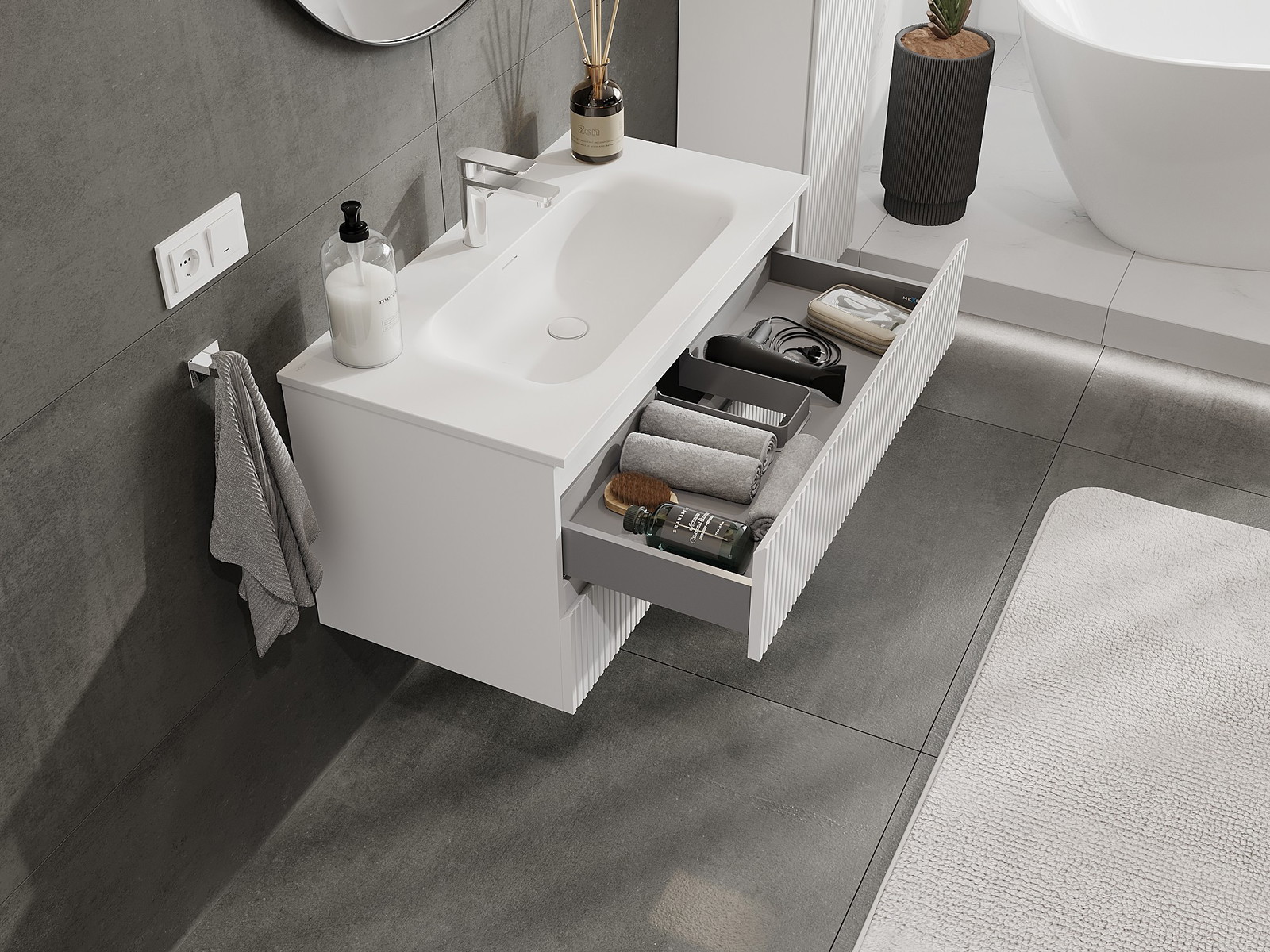 Our modular bathroom furniture can be combined in various colour configurations, allowing for complete personalisation. You can choose both the appearance and functions of individual elements, enabling you to adapt the furniture to your own stylistic and functional preferences.