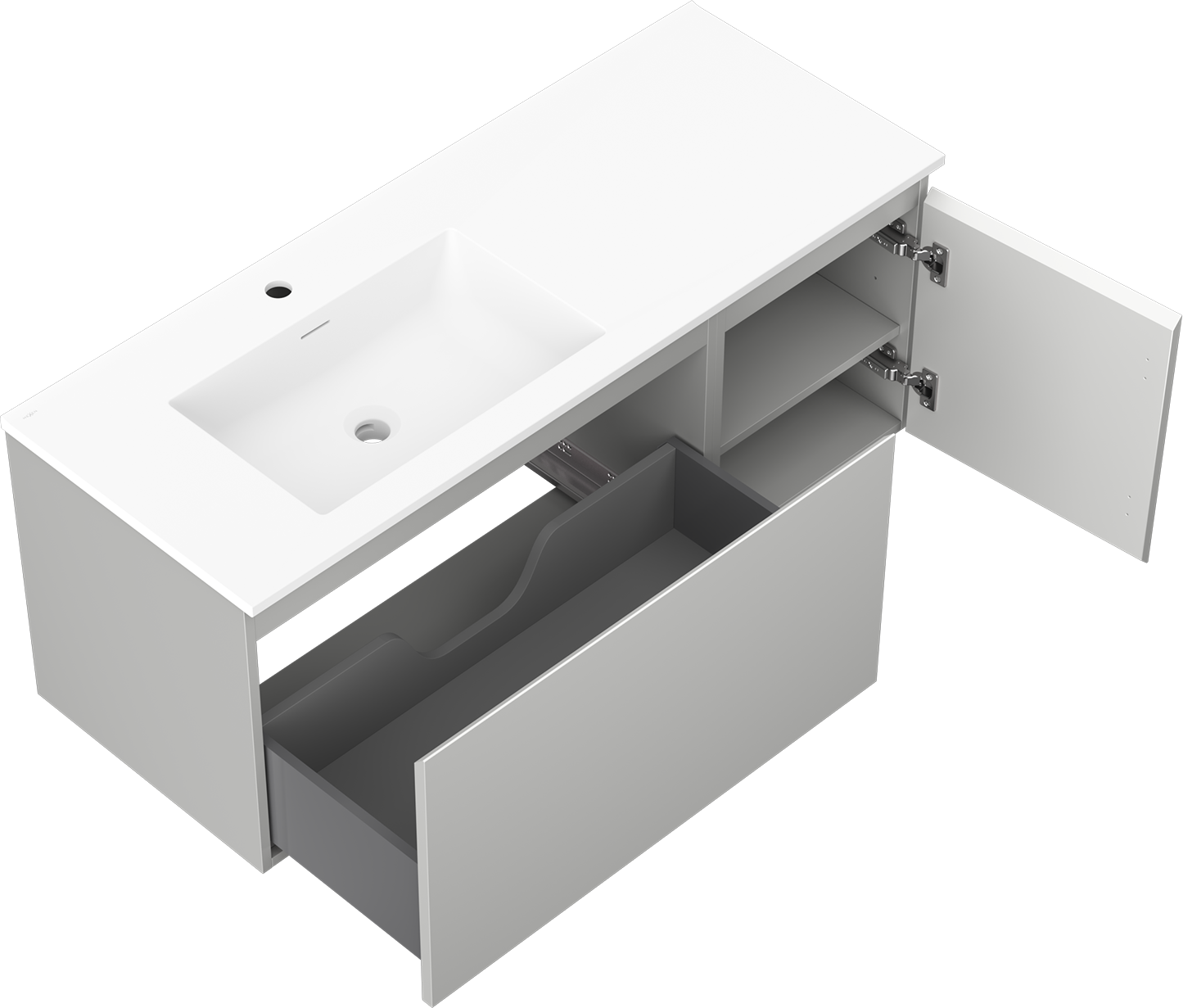 The cutout in the drawer is designed in such a way as to accommodate the siphon, which is essential in sink installations. This allows the furniture to be fully functional without having to give up drawer space for the installation.
