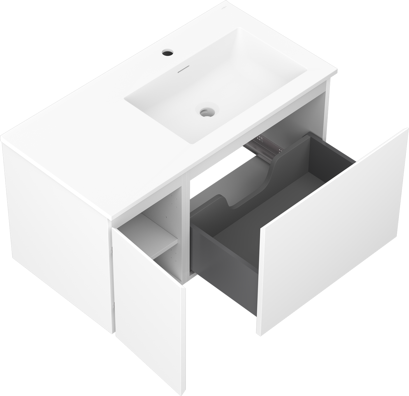 The cutout in the drawer is designed in such a way as to accommodate the siphon, which is essential in sink installations. This allows the furniture to be fully functional without having to give up drawer space for the installation.