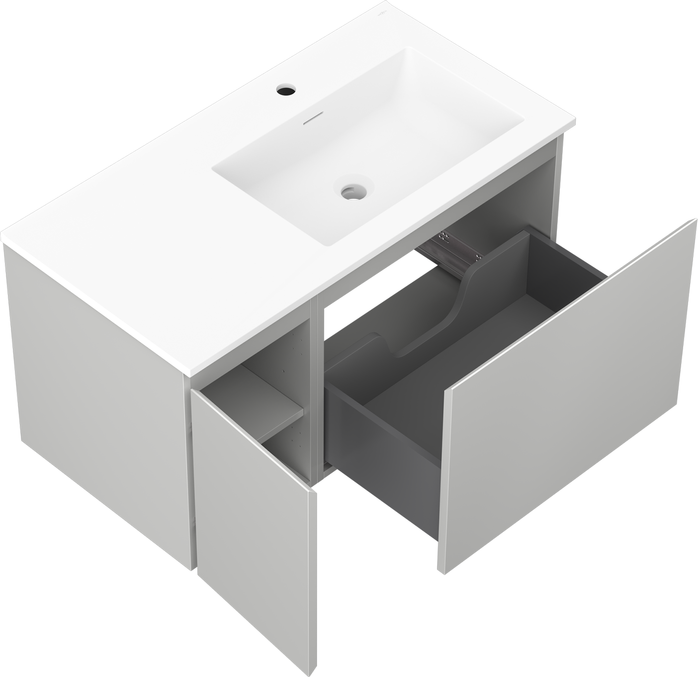 The cutout in the drawer is designed in such a way as to accommodate the siphon, which is essential in sink installations. This allows the furniture to be fully functional without having to give up drawer space for the installation.