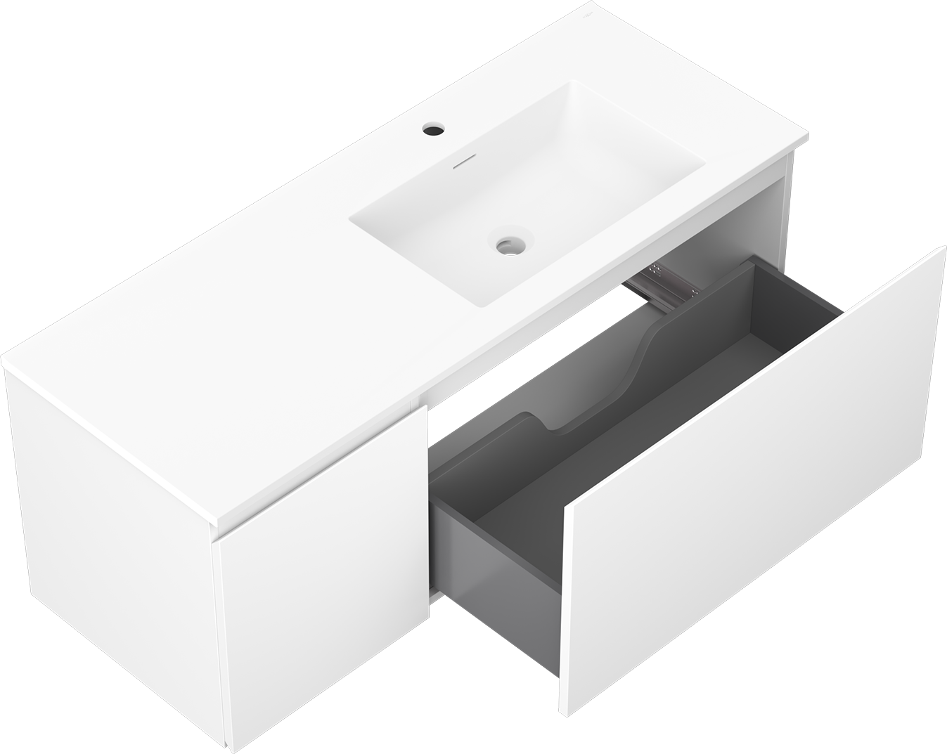 The cutout in the drawer is designed in such a way as to accommodate the siphon, which is essential in sink installations. This allows the furniture to be fully functional without having to give up drawer space for the installation.
