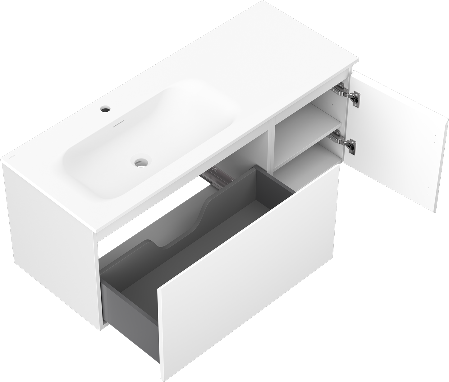The cutout in the drawer is designed in such a way as to accommodate the siphon, which is essential in sink installations. This allows the furniture to be fully functional without having to give up drawer space for the installation.