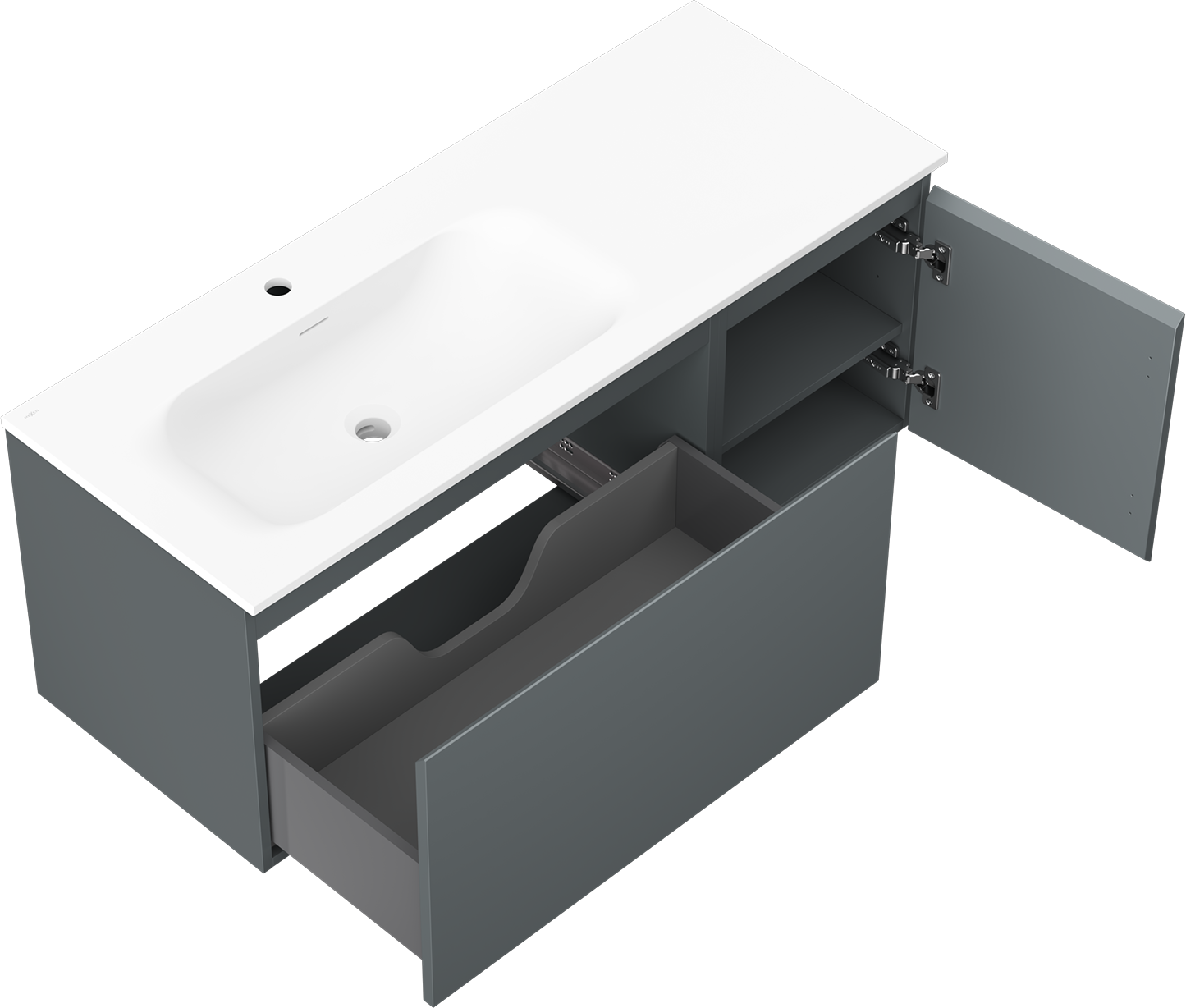 The cutout in the drawer is designed in such a way as to accommodate the siphon, which is essential in sink installations. This allows the furniture to be fully functional without having to give up drawer space for the installation.