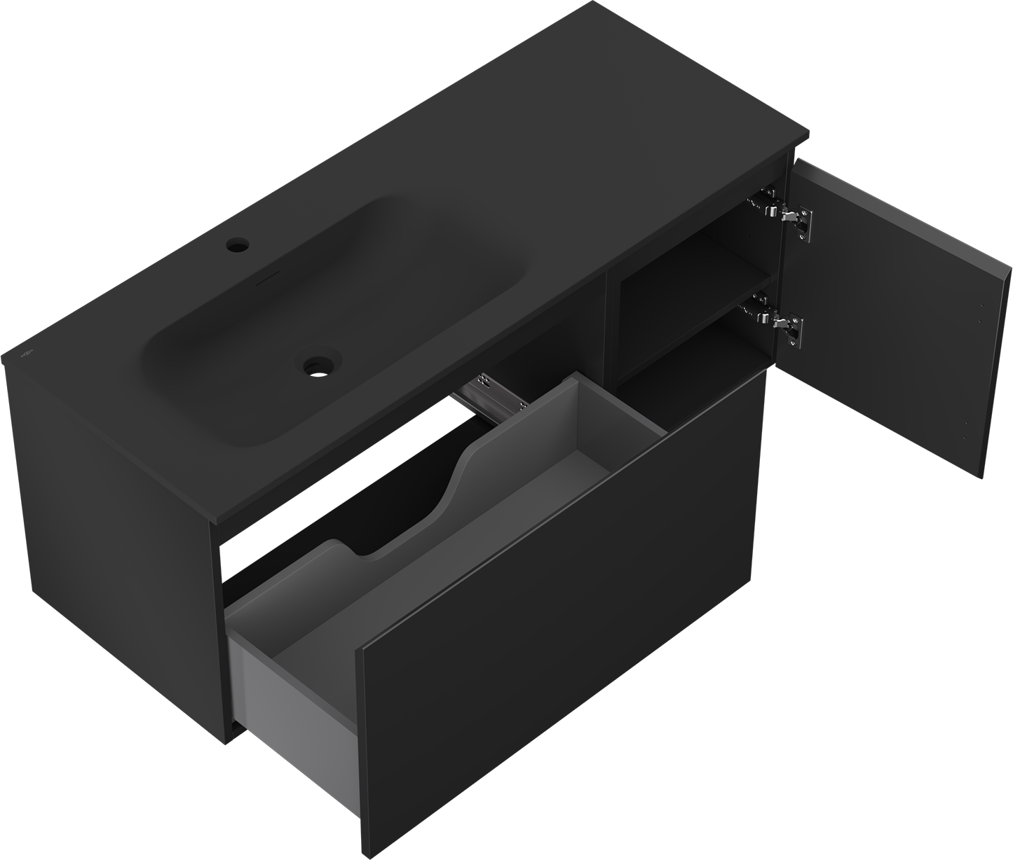 The cutout in the drawer is designed in such a way as to accommodate the siphon, which is essential in sink installations. This allows the furniture to be fully functional without having to give up drawer space for the installation.