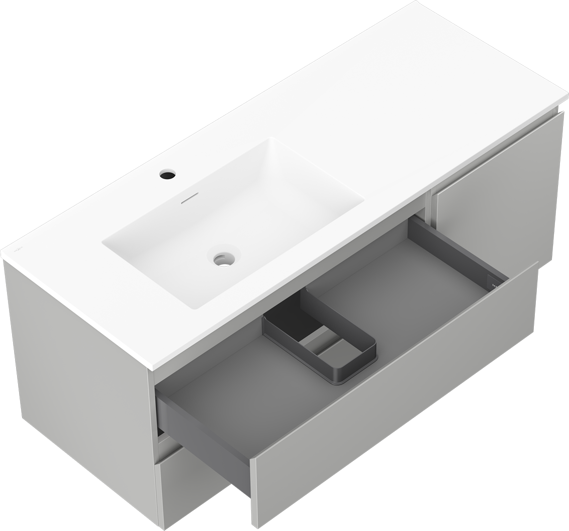 The cutout in the drawer is designed in such a way as to accommodate the siphon, which is essential in sink installations. This allows the furniture to be fully functional without having to give up drawer space for the installation.