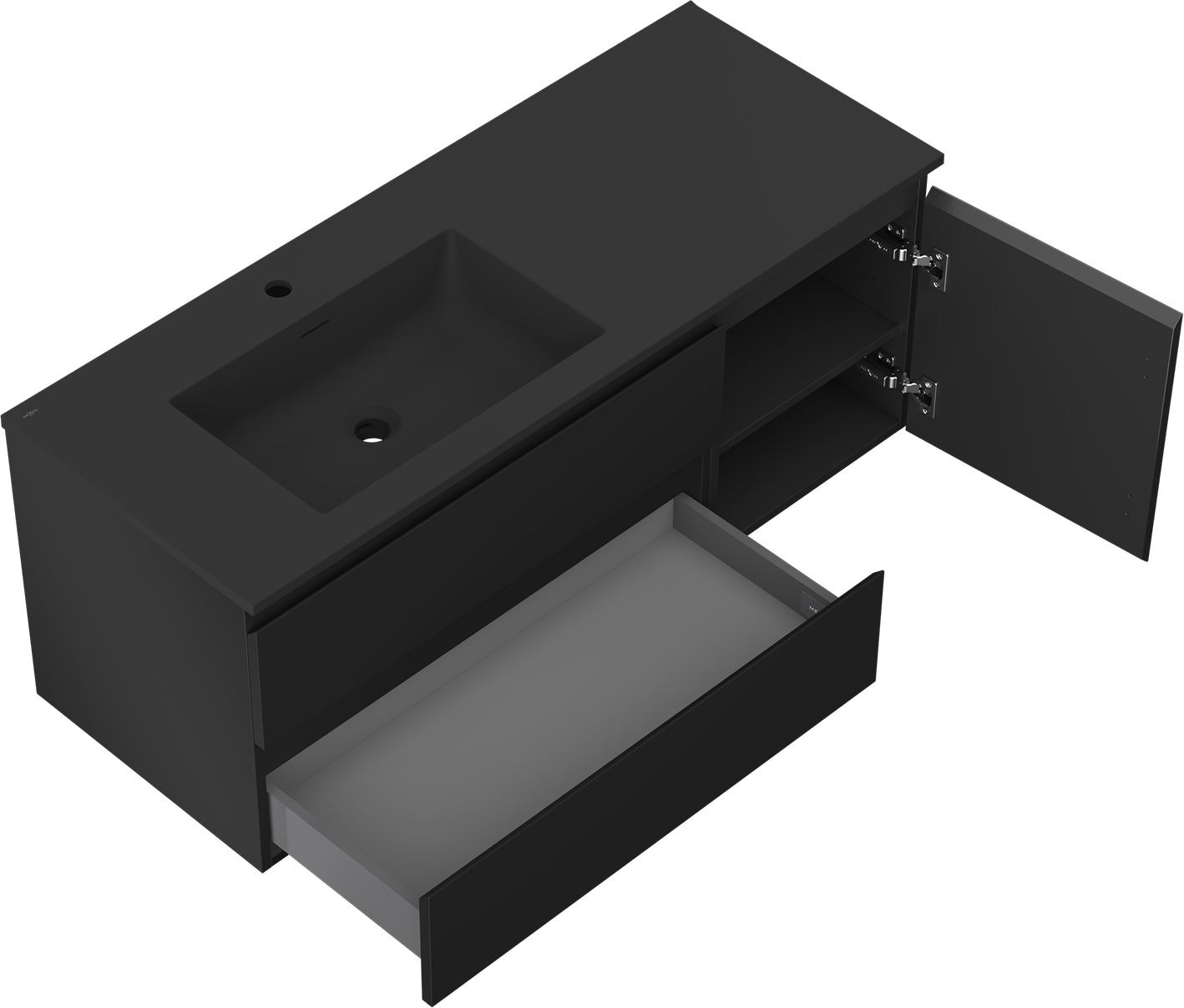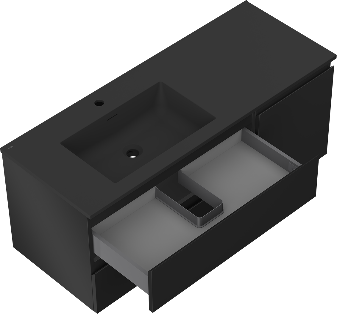 The cutout in the drawer is designed in such a way as to accommodate the siphon, which is essential in sink installations. This allows the furniture to be fully functional without having to give up drawer space for the installation.