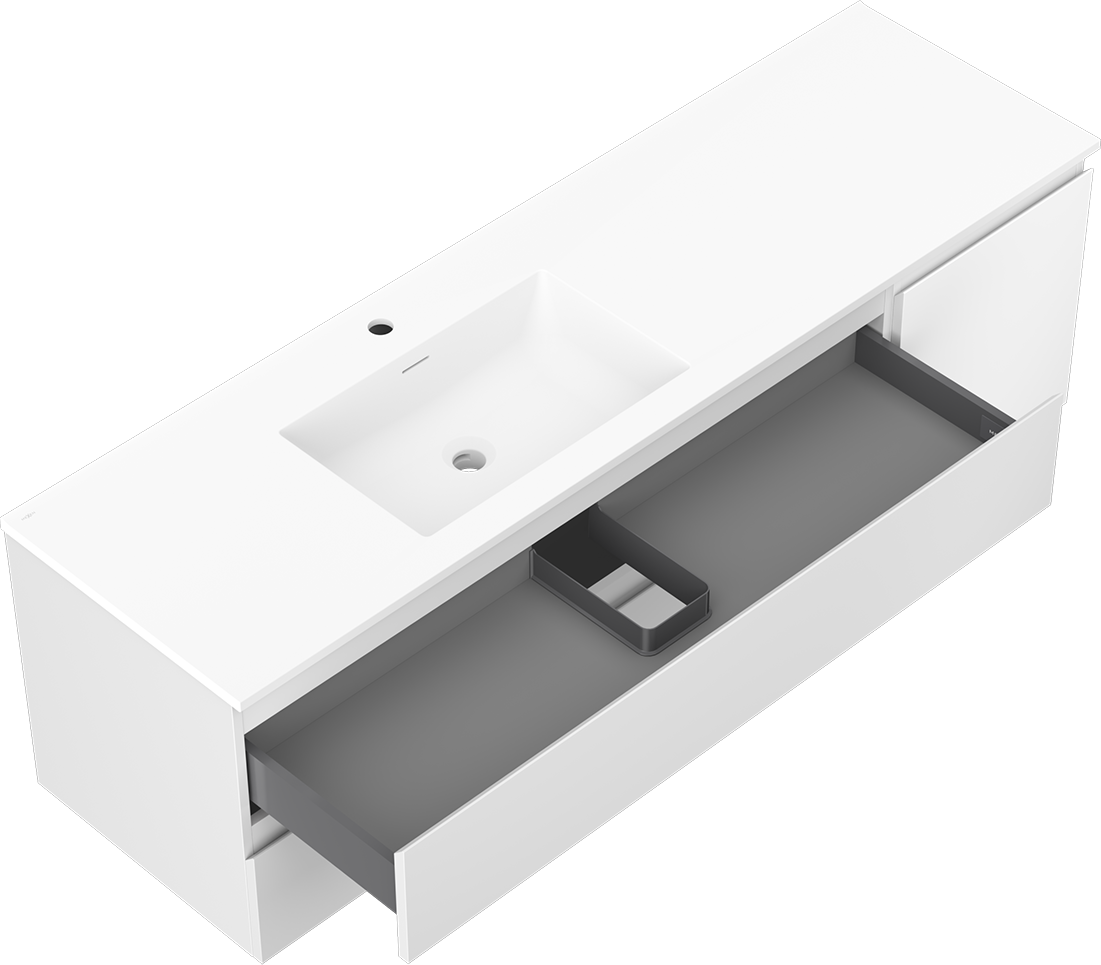 The cutout in the drawer is designed in such a way as to accommodate the siphon, which is essential in sink installations. This allows the furniture to be fully functional without having to give up drawer space for the installation.