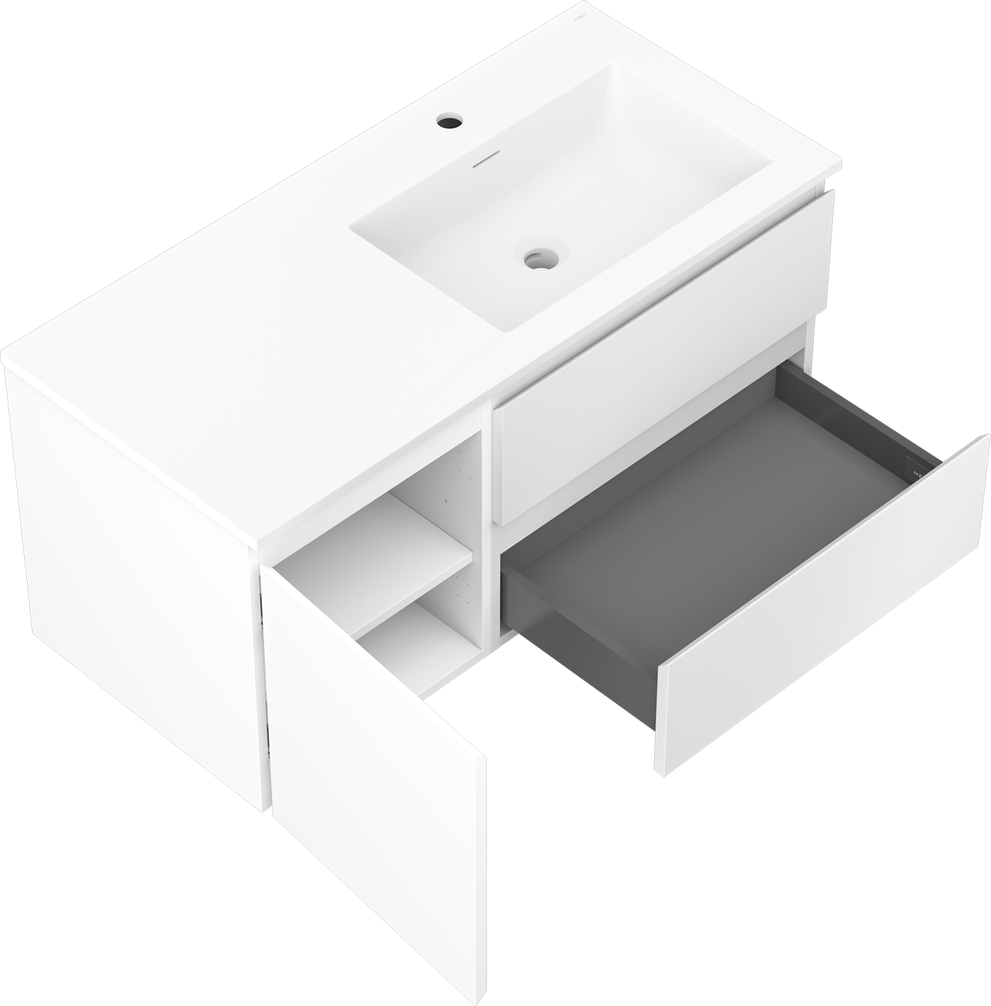 The cutout in the drawer is designed in such a way as to accommodate the siphon, which is essential in sink installations. This allows the furniture to be fully functional without having to give up drawer space for the installation.