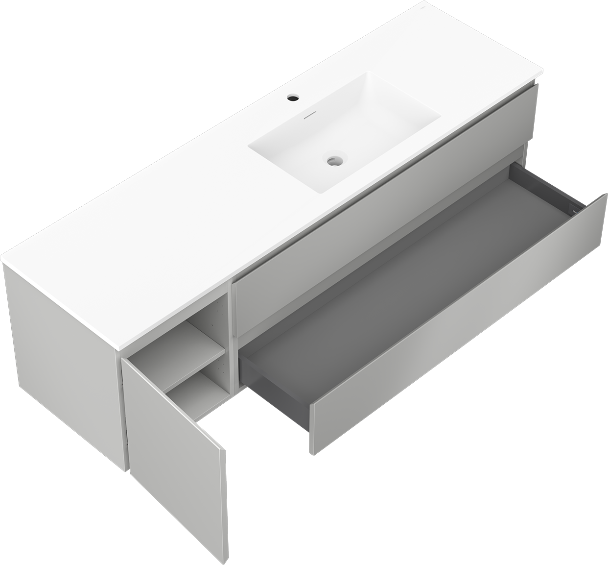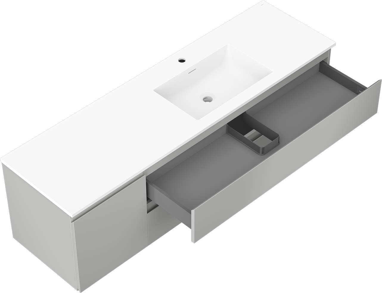 The cutout in the drawer is designed in such a way as to accommodate the siphon, which is essential in sink installations. This allows the furniture to be fully functional without having to give up drawer space for the installation.