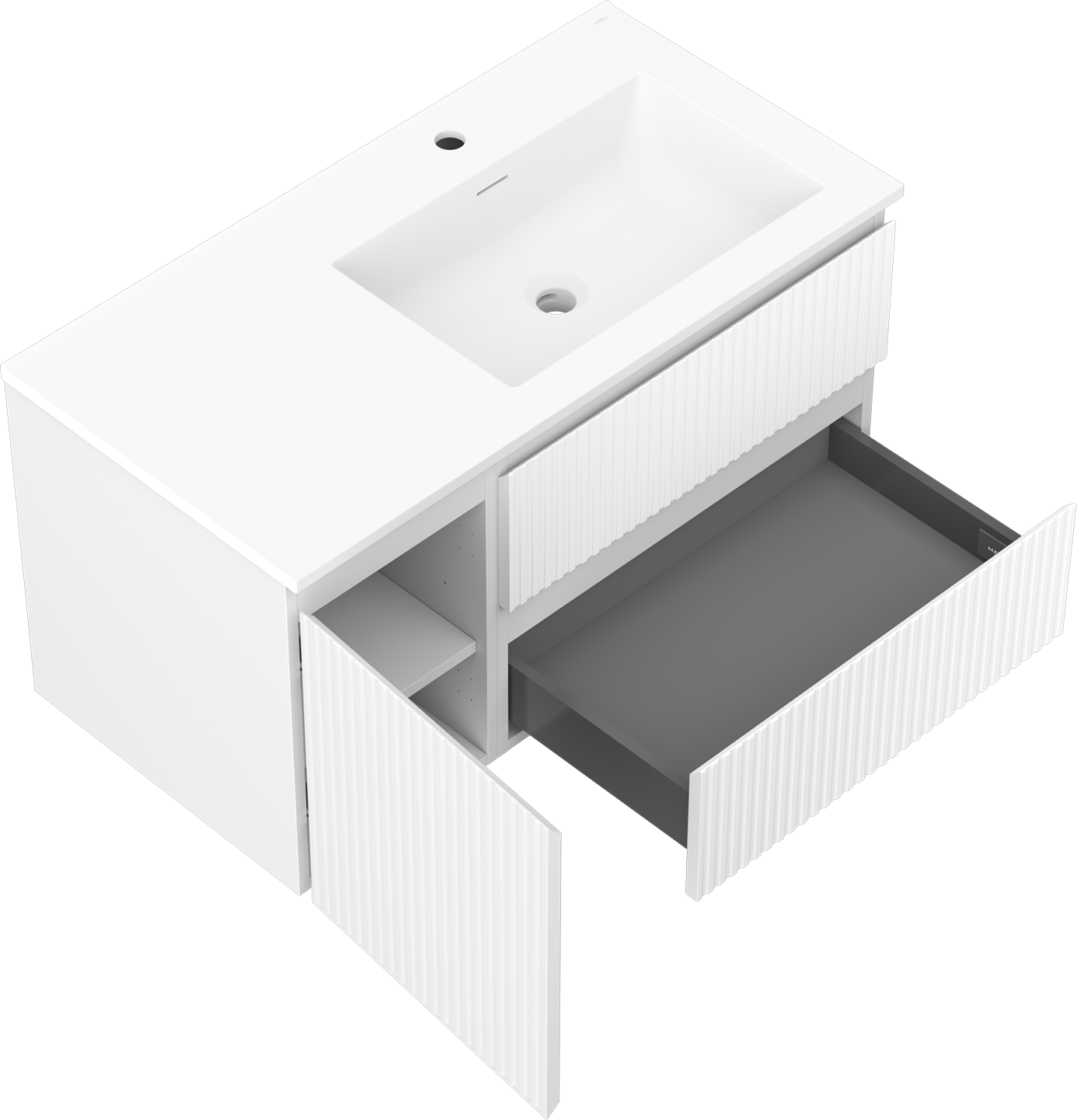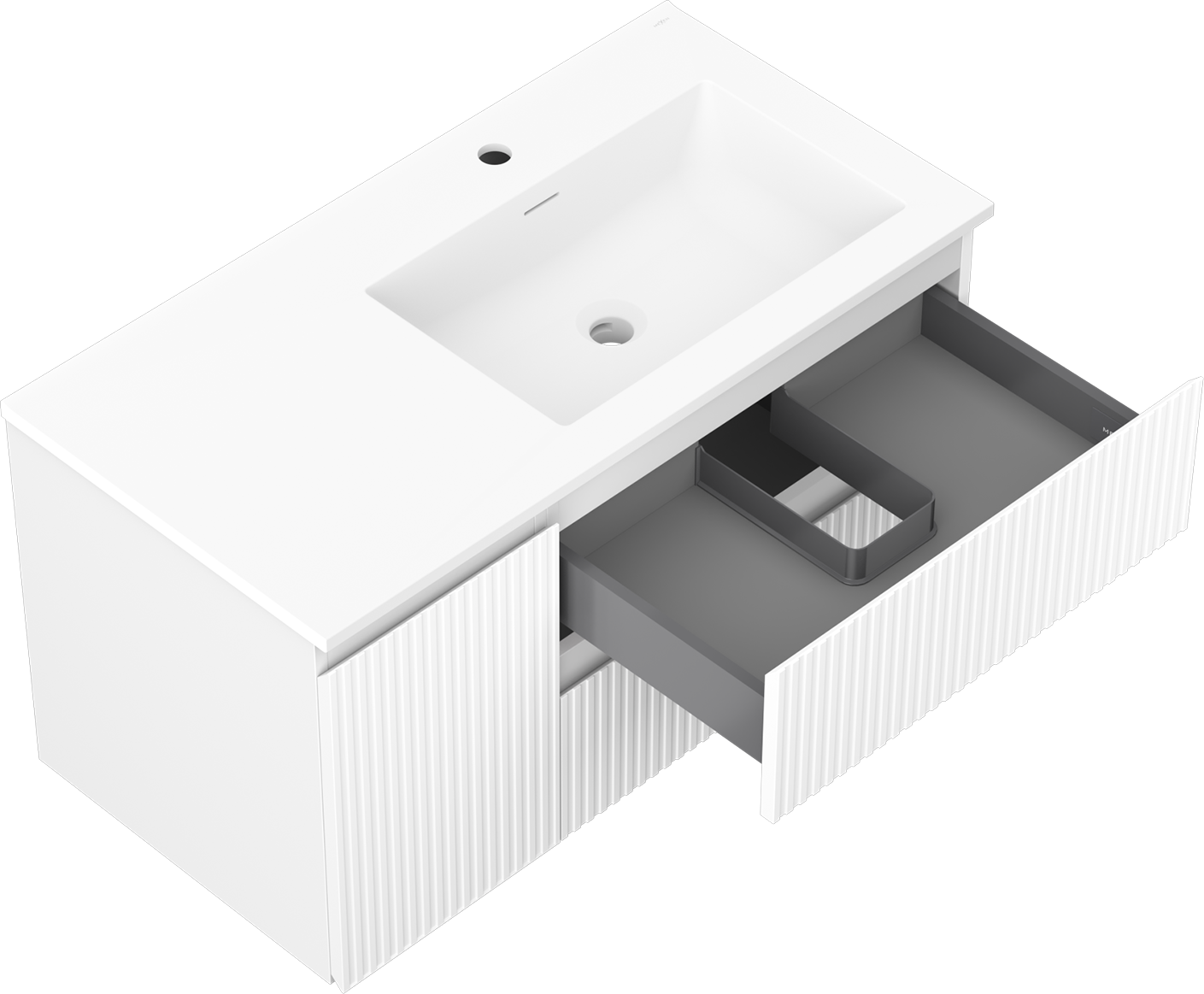 The cutout in the drawer is designed in such a way as to accommodate the siphon, which is essential in sink installations. This allows the furniture to be fully functional without having to give up drawer space for the installation.