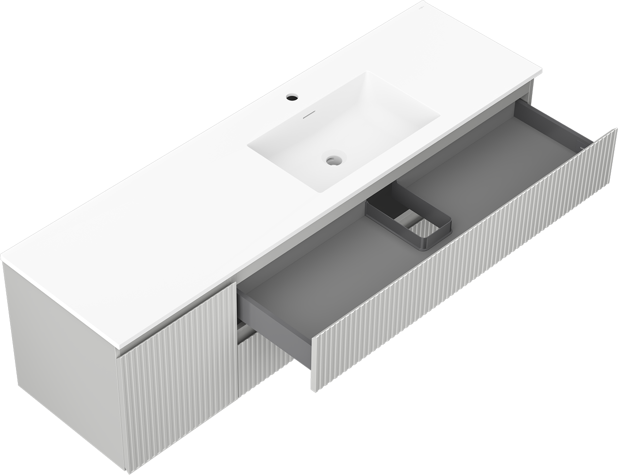The cutout in the drawer is designed in such a way as to accommodate the siphon, which is essential in sink installations. This allows the furniture to be fully functional without having to give up drawer space for the installation.