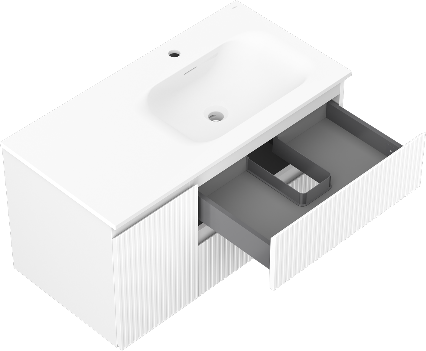 The cutout in the drawer is designed in such a way as to accommodate the siphon, which is essential in sink installations. This allows the furniture to be fully functional without having to give up drawer space for the installation.
