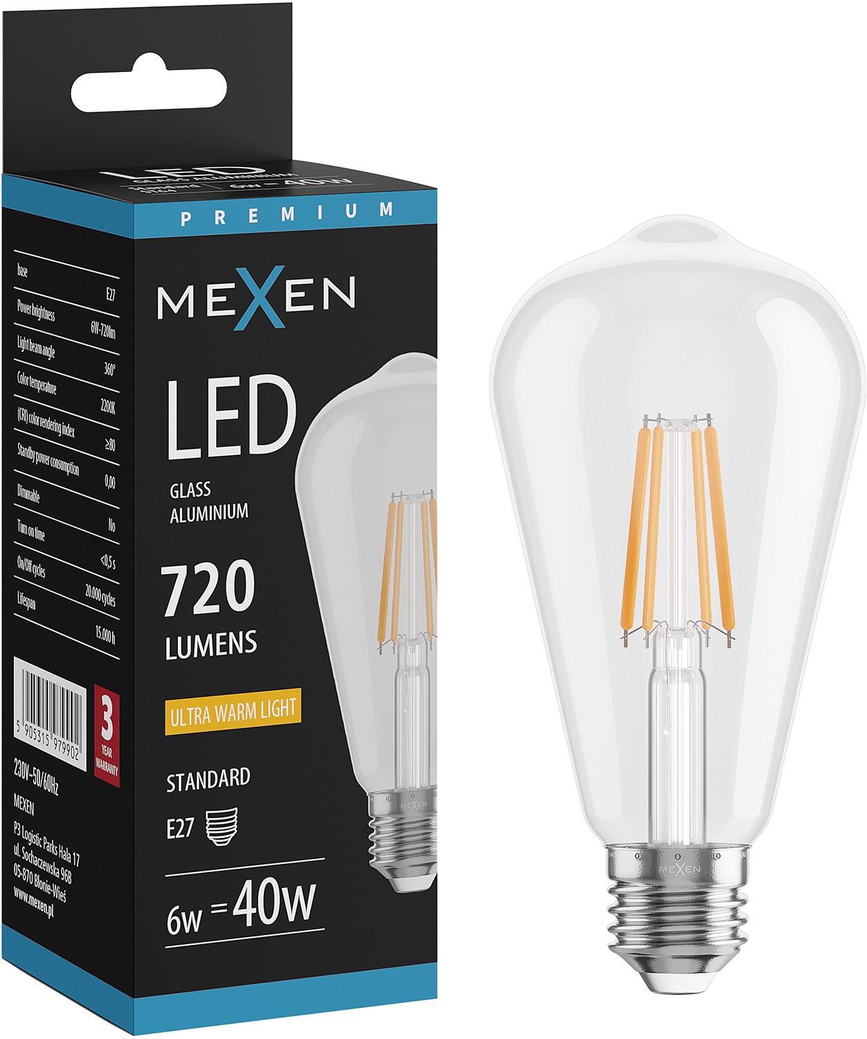 Mexen Vintis LED Filament Bulb E27, ST64, 6W, Warm - 2200K, 720 lm, clear - L152-E27-0622-00