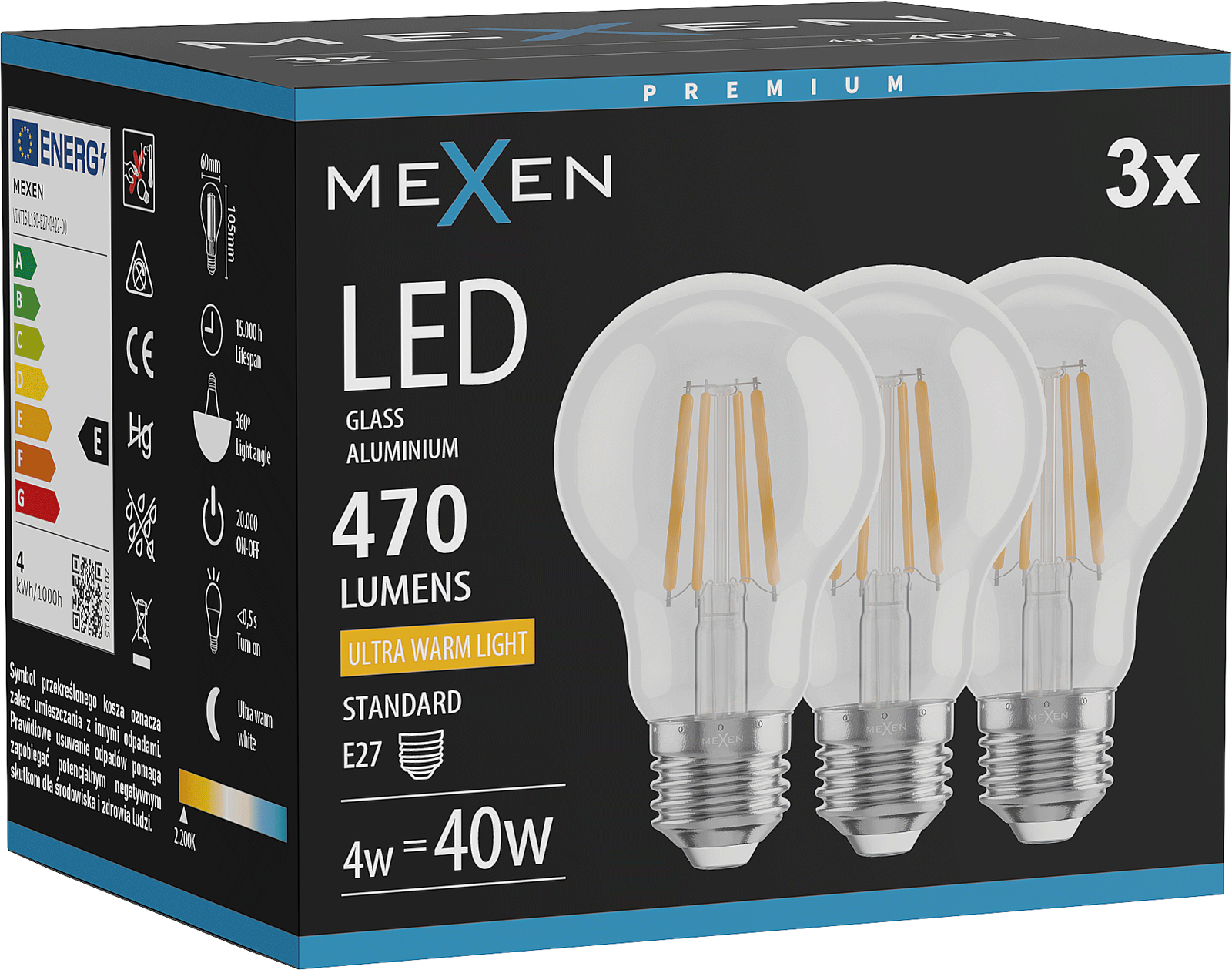 Mexen Vintis 3x LED Filament Bulb E27, A60, 4W, Warm - 2200K, 470 lm, clear - L150-E27-0422-00x03
