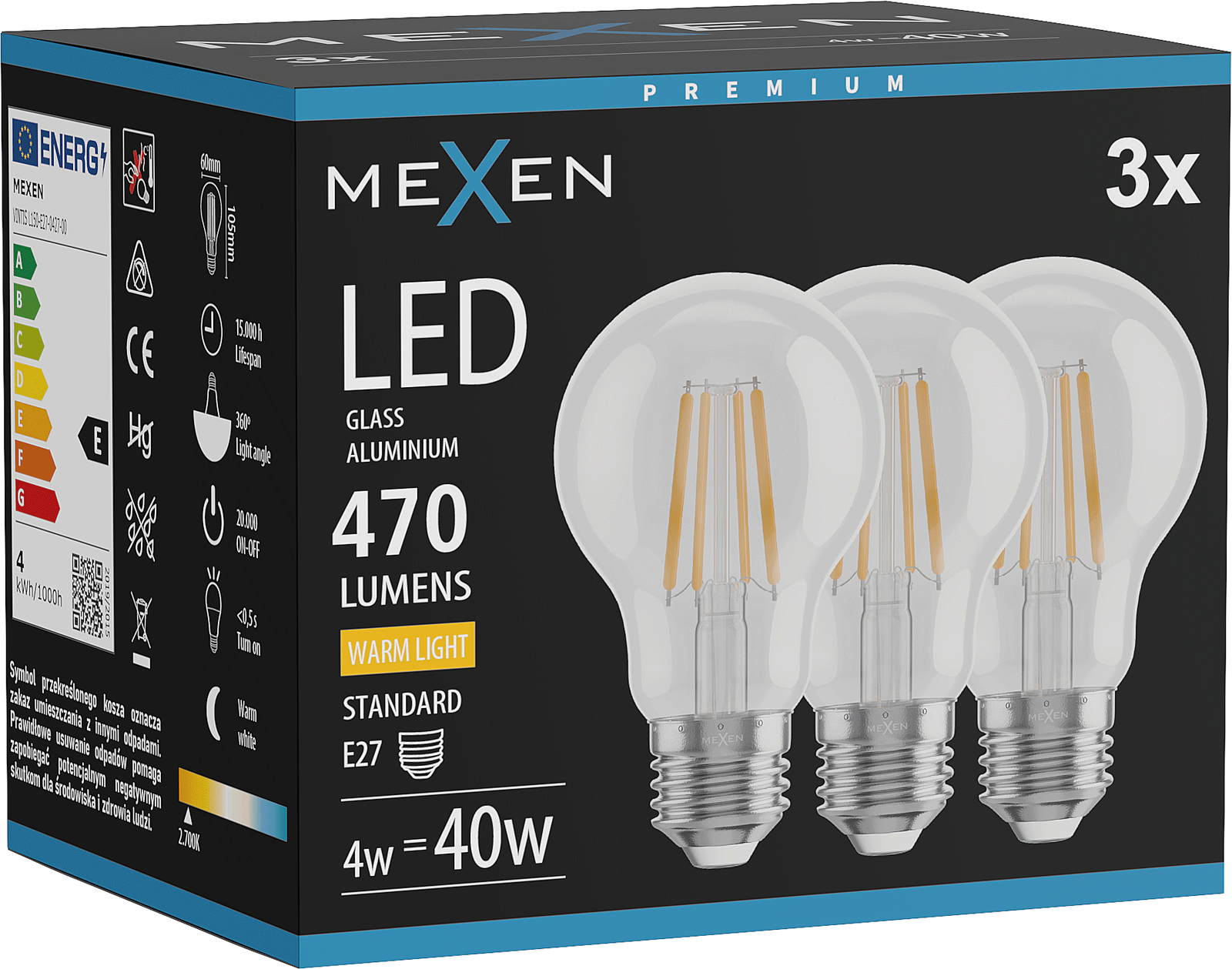 Mexen Vintis 3x LED filament bulb E27, A60, 4W, Warm - 2700K, 470 lm, clear - L150-E27-0427-00x03