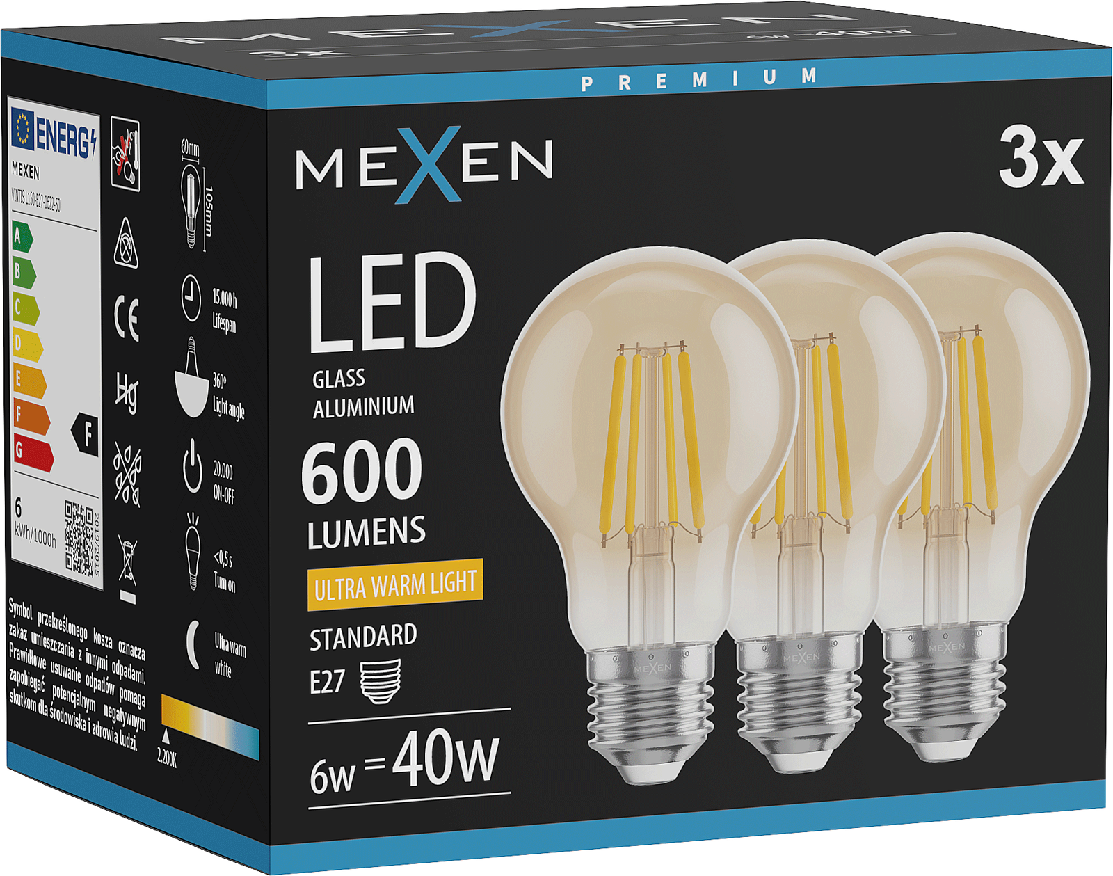 Mexen Vintis 3x LED Filament Bulb E27, A60, 6W, Warm - 2200K, 600 lm, amber - L150-E27-0622-50x03