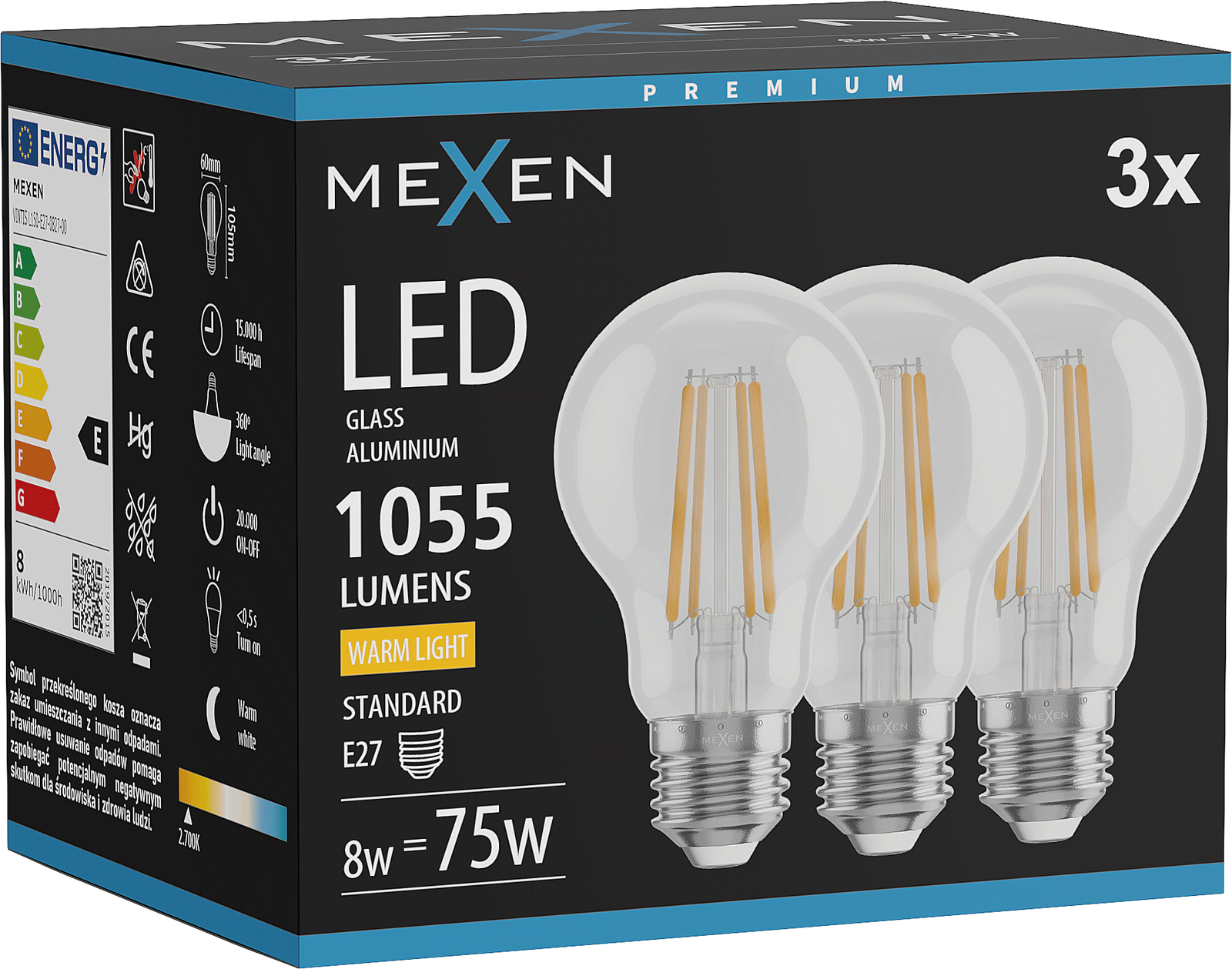 Mexen Vintis 3x LED Filament Bulb E27, A60, 8W, Warm - 2700K, 1055 lm, clear - L150-E27-0827-00x03