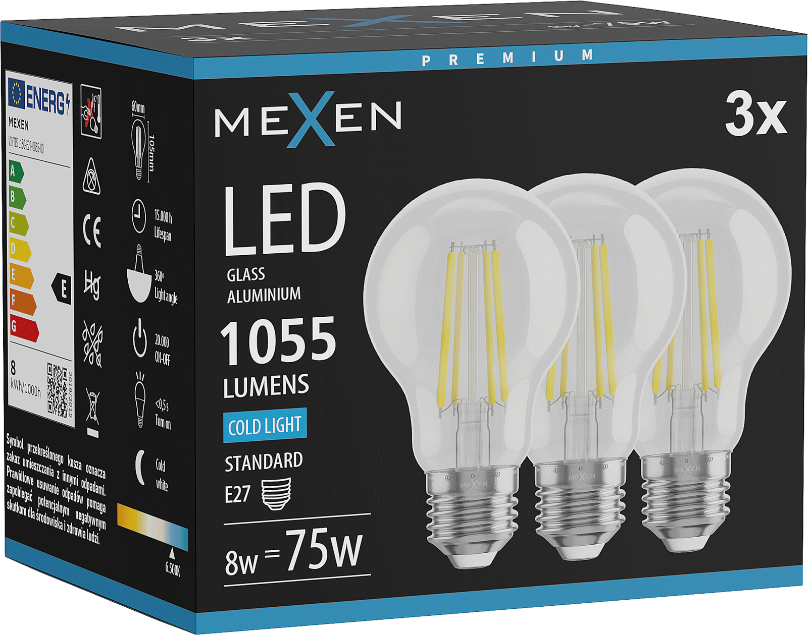 Mexen Vintis 3x LED Filament Bulb E27, A60, 8W, Cold - 6500K, 1055 lm, clear - L150-E27-0865-00x03