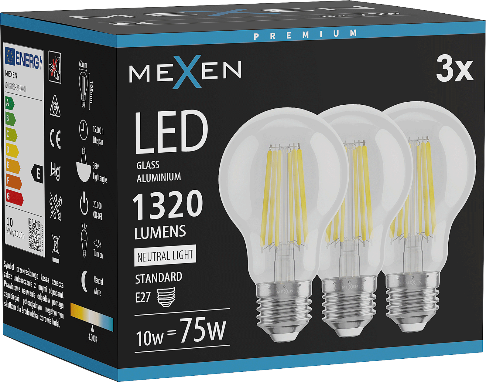 Mexen Vintis 3x LED Filament Bulb E27, A60, 10W, Neutral - 4000K, 1320 lm, Clear - L150-E27-1040-00x03