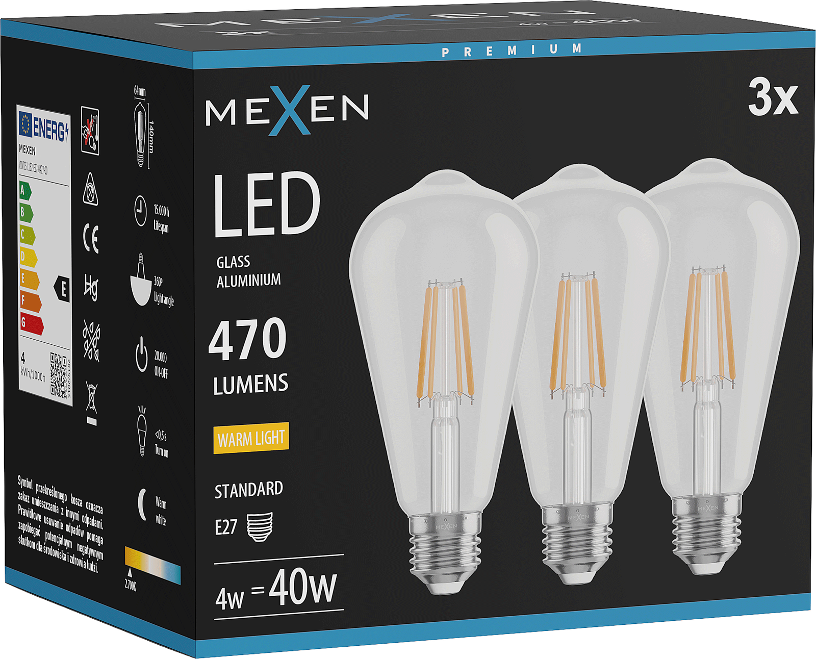 Mexen Vintis 3x Filament LED Bulb E27, ST64, 4W, Warm - 2700K, 470 lm, clear - L152-E27-0427-00x03