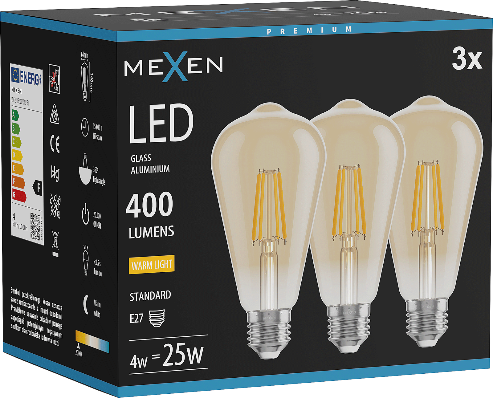 Mexen Vintis 3x Filament LED Bulb E27, ST64, 4W, Warm - 2700K, 400 lm, amber - L152-E27-0427-50x03