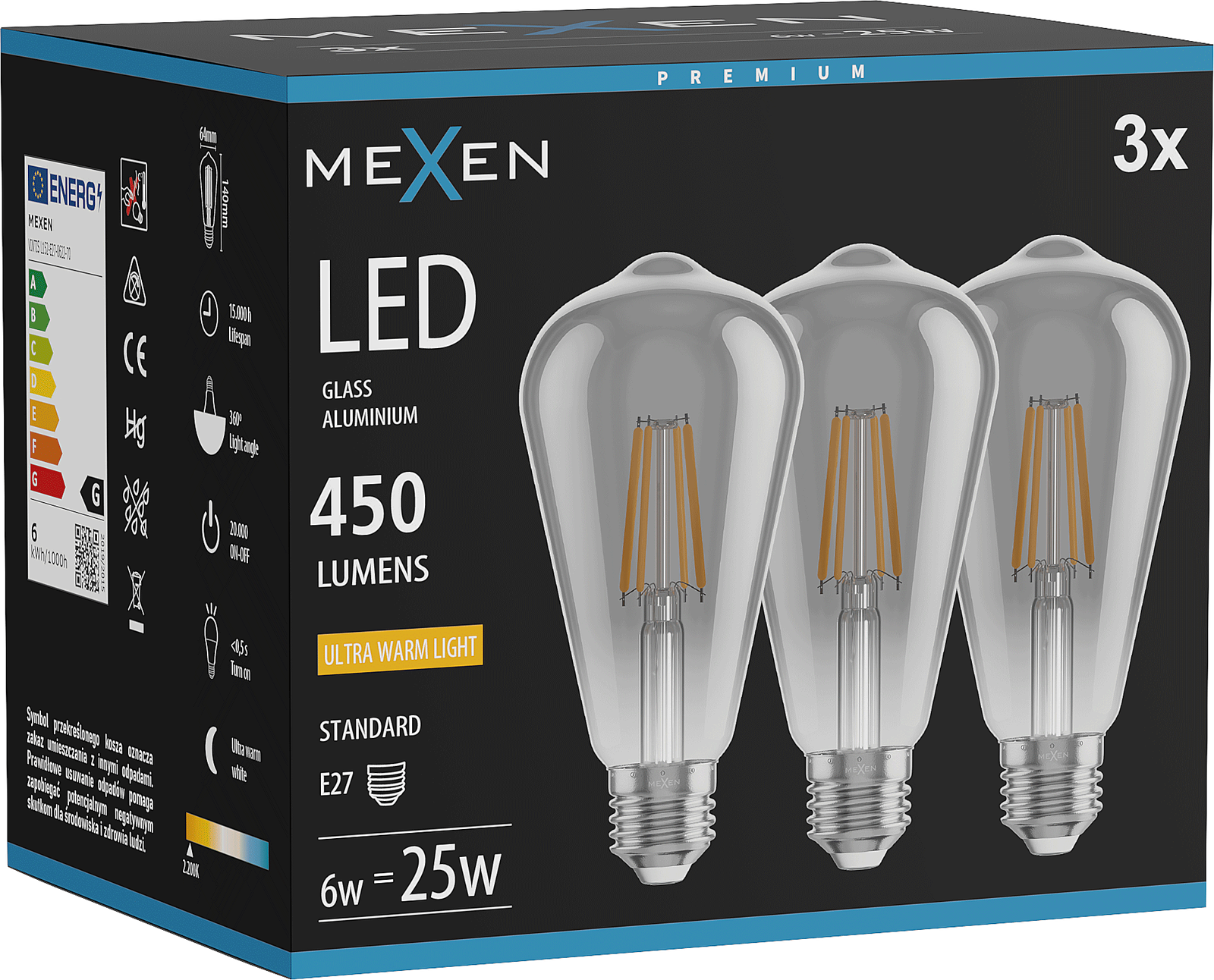 Mexen Vintis 3x LED Filament Bulb E27, ST64, 6W, Warm - 2200K, 450 lm, smoke - L152-E27-0622-70x03