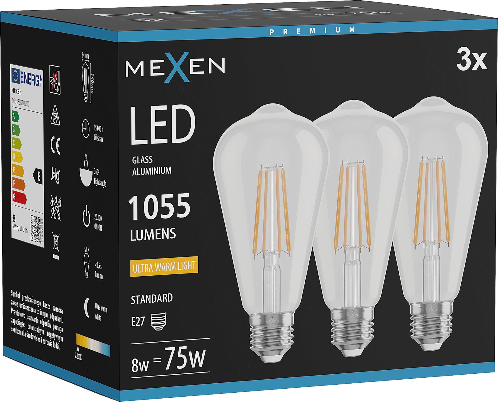 Mexen Vintis 3x LED Filament Bulb E27, ST64, 8W, Warm - 2200K, 1055 lm, clear - L152-E27-0822-00x03
