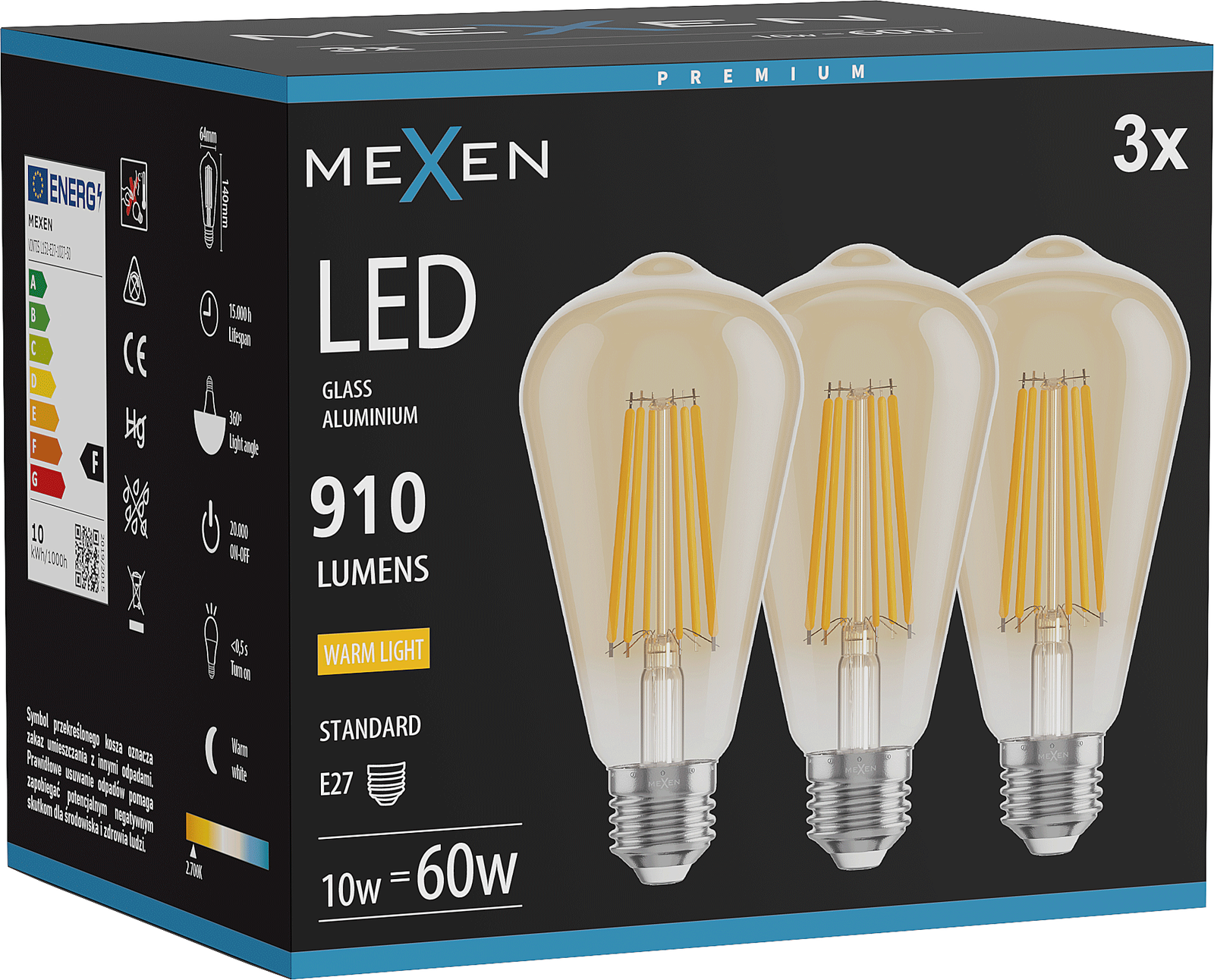 Mexen Vintis 3x LED Filament Bulb E27, ST64, 10W, Warm - 2700K, 910 lm, amber - L152-E27-1027-50x03