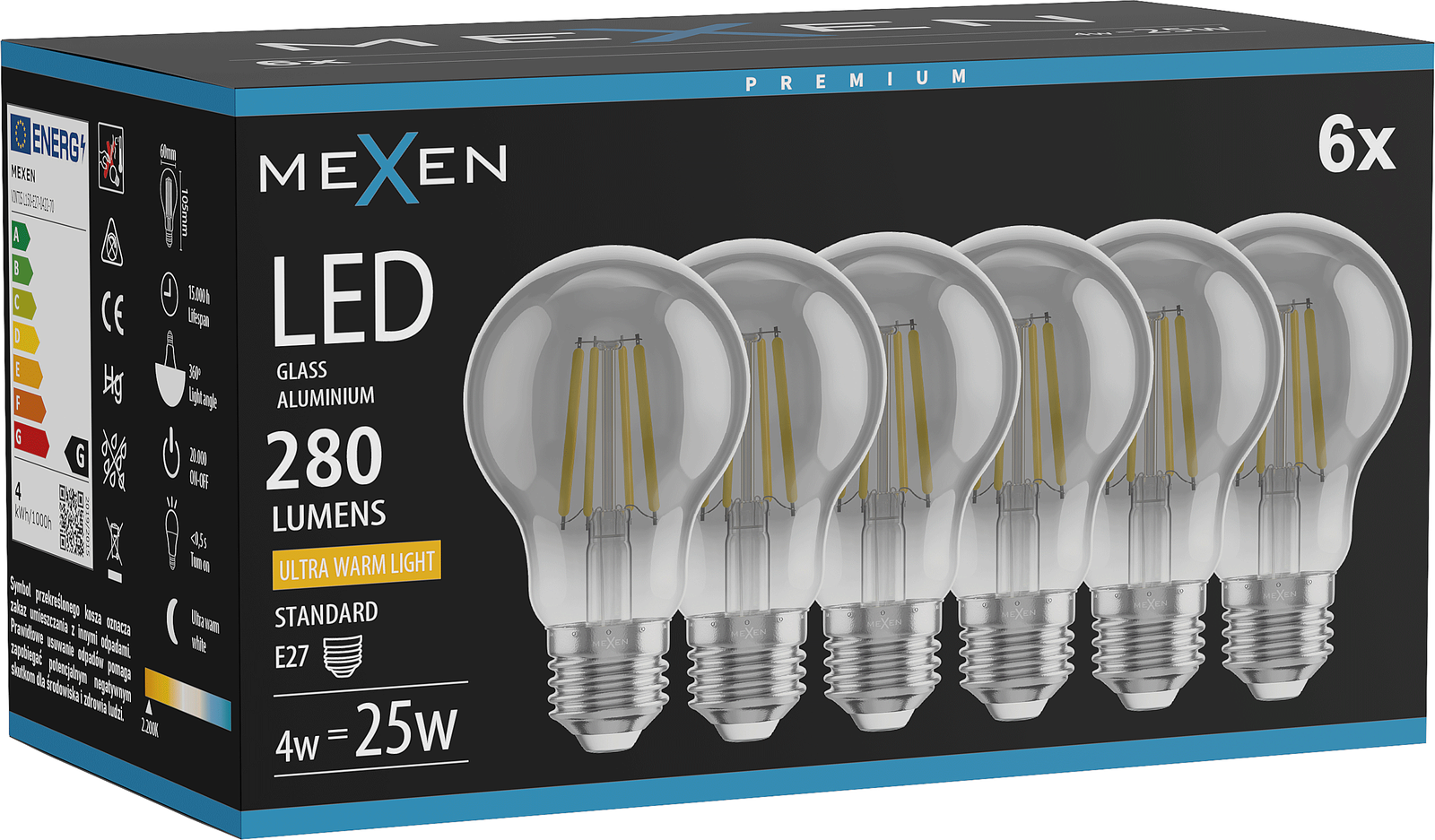 Mexen Vintis 6x LED Filament Bulb E27, A60, 4W, Warm - 2200K, 280 lm, smoke - L150-E27-0422-70x06
