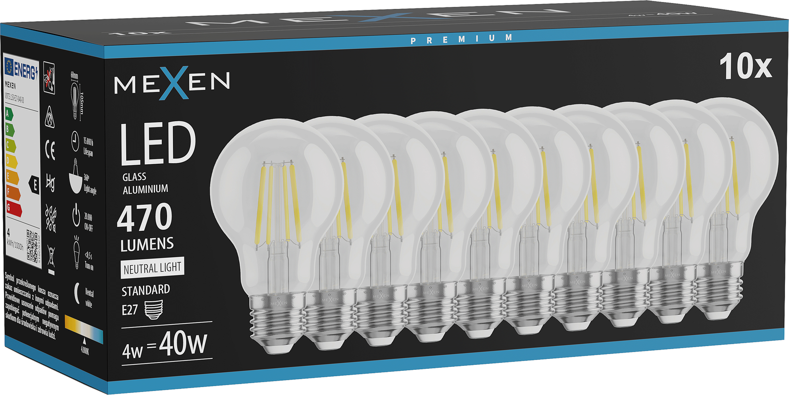 Mexen Vintis 10x LED Filament Bulb E27, A60, 4W, Neutral - 4000K, 470 lm, clear - L150-E27-0440-00x10