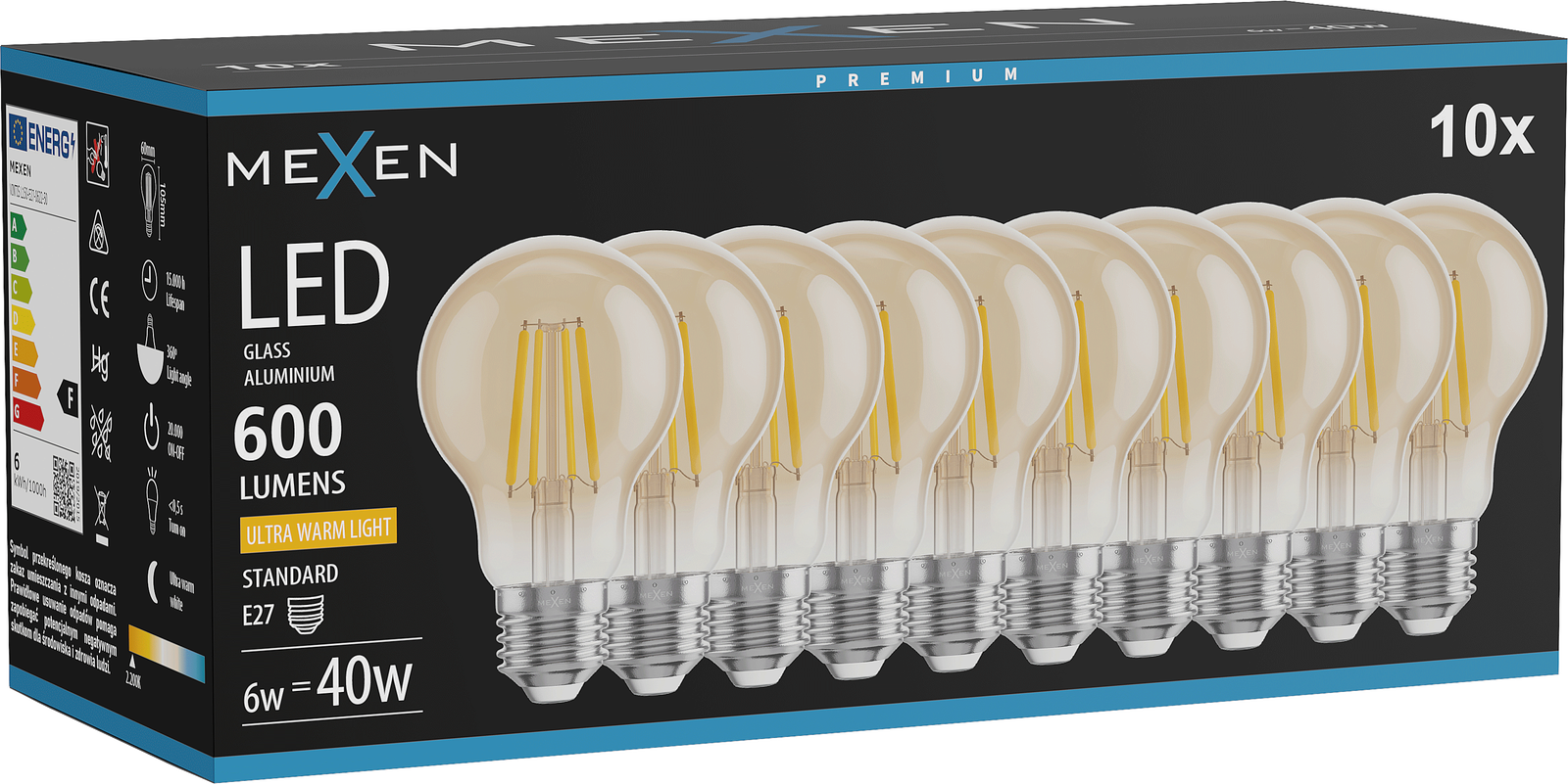 Mexen Vintis 10x LED Filament Bulb E27, A60, 6W, Warm - 2200K, 600 lm, amber - L150-E27-0622-50x10