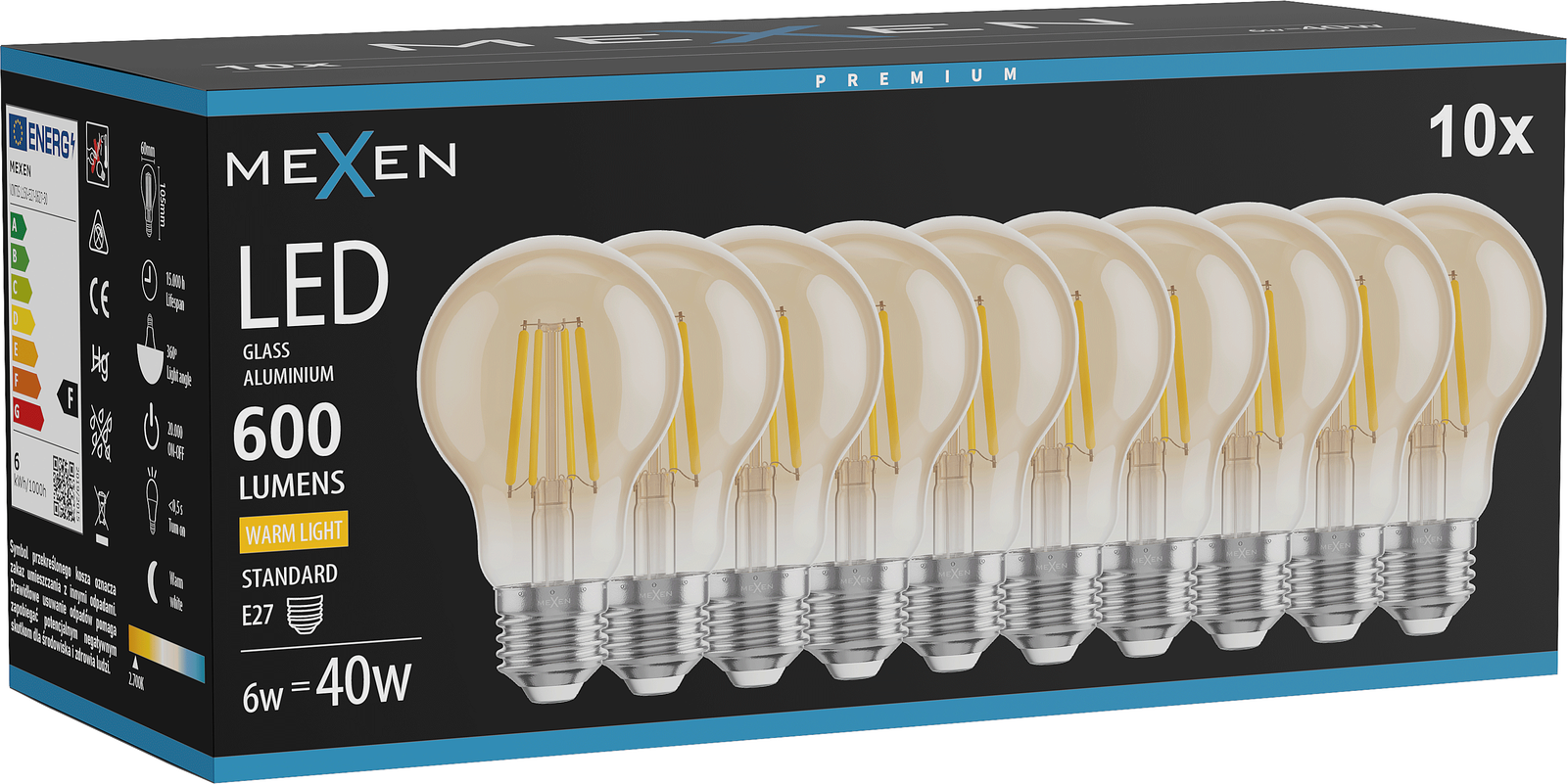 Mexen Vintis 10x LED Filament Bulb E27, A60, 6W, Warm - 2700K, 600 lm, amber - L150-E27-0627-50x10