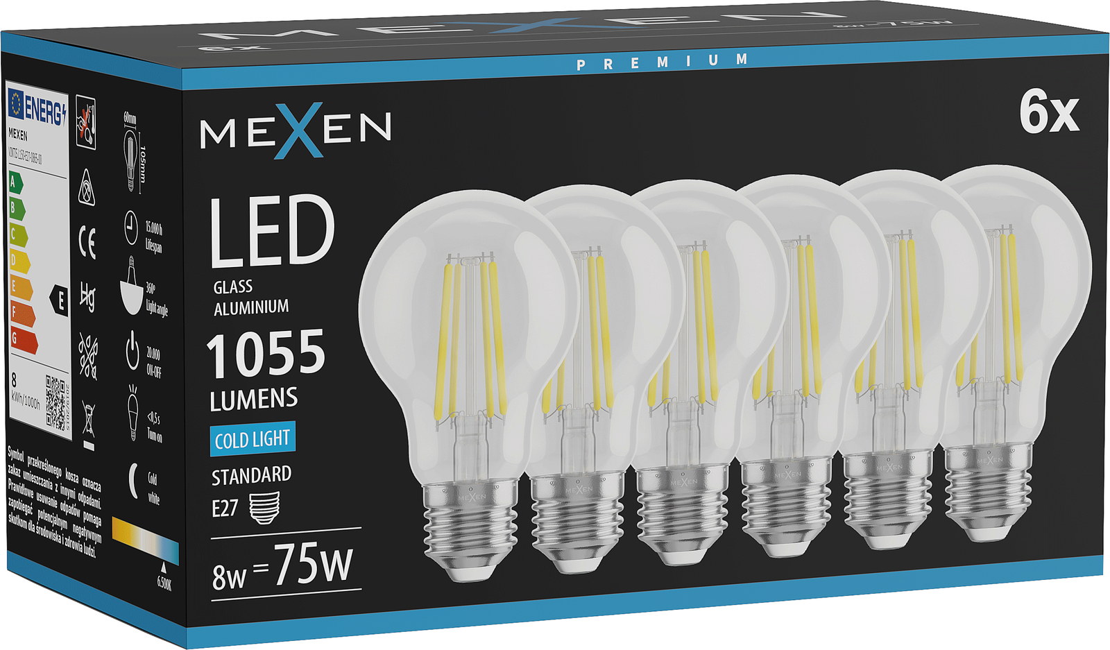 Mexen Vintis 6x LED Filament Bulb E27, A60, 8W, Cool - 6500K, 1055 lm, clear - L150-E27-0865-00x06