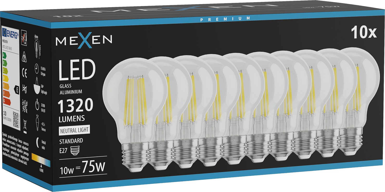 Mexen Vintis 10x LED Filament Bulb E27, A60, 10W, Neutral - 4000K, 1320 lm, clear - L150-E27-1040-00x10