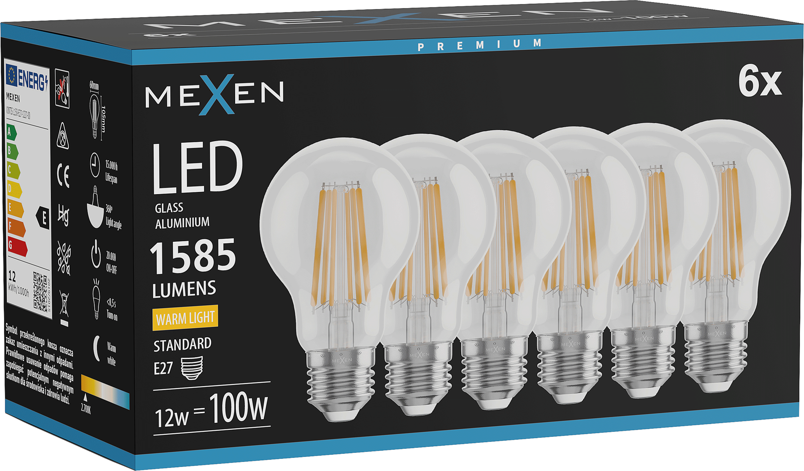 Mexen Vintis 6x LED Filament Bulb E27, A60, 12W, Warm - 2700K, 1585 lm, clear - L150-E27-1227-00x06