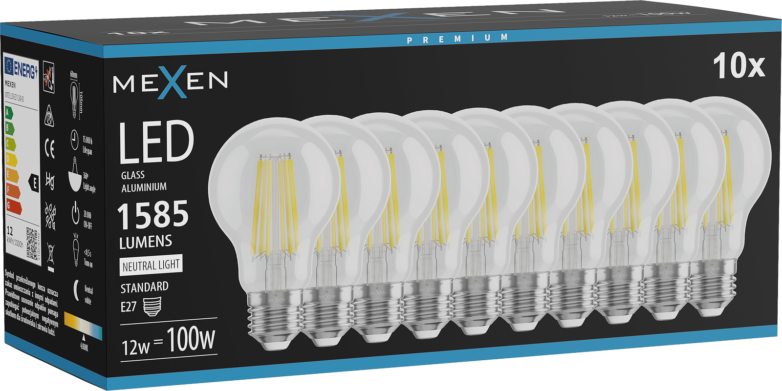 Mexen Vintis 10x LED Filament Bulb E27, A60, 12W, Neutral - 4000K, 1585 lm, clear - L150-E27-1240-00x10