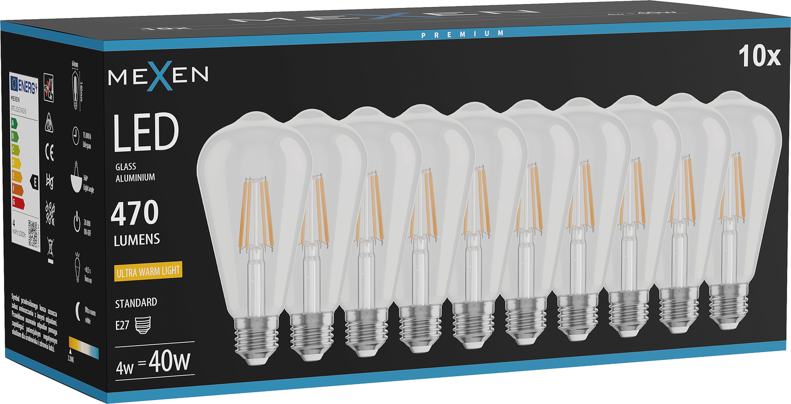 Mexen Vintis 10x LED Filament Bulb E27, ST64, 4W, Warm - 2200K, 470 lm, Clear - L152-E27-0422-00x10