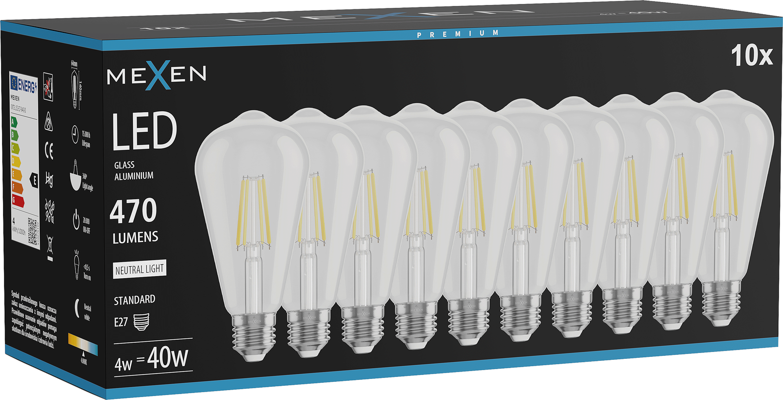Mexen Vintis 10x LED Filament Bulb E27, ST64, 4W, Neutral - 4000K, 470 lm, clear - L152-E27-0440-00x10