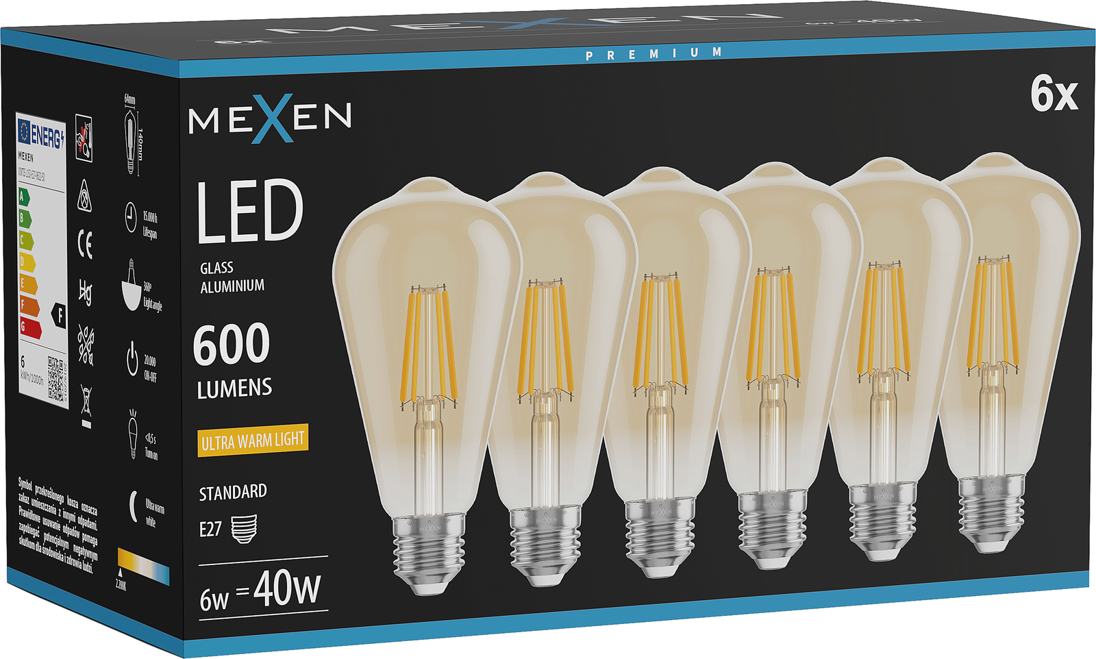 Mexen Vintis 6x LED filament bulb E27, ST64, 6W, Warm - 2200K, 600 lm, amber - L152-E27-0622-50x06