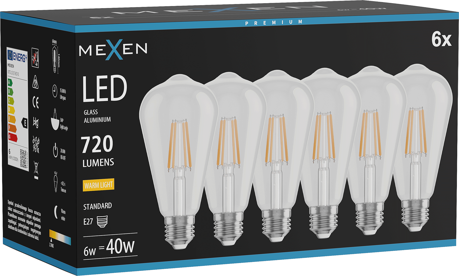 Mexen Vintis 6x LED Filament Bulb E27, ST64, 6W, Warm - 2700K, 720 lm, clear - L152-E27-0627-00x06