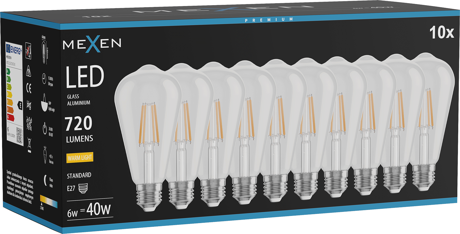 Mexen Vintis 10x LED Filament Bulb E27, ST64, 6W, Warm - 2700K, 720 lm, clear - L152-E27-0627-00x10