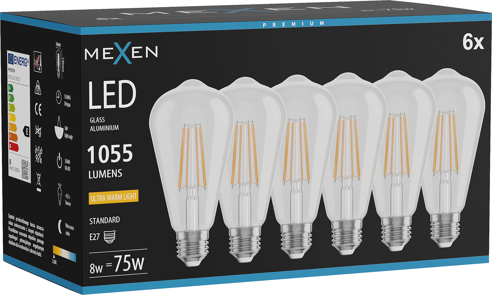 Mexen Vintis 6x LED Filament Bulb E27, ST64, 8W, Warm - 2200K, 1055 lm, clear - L152-E27-0822-00x06