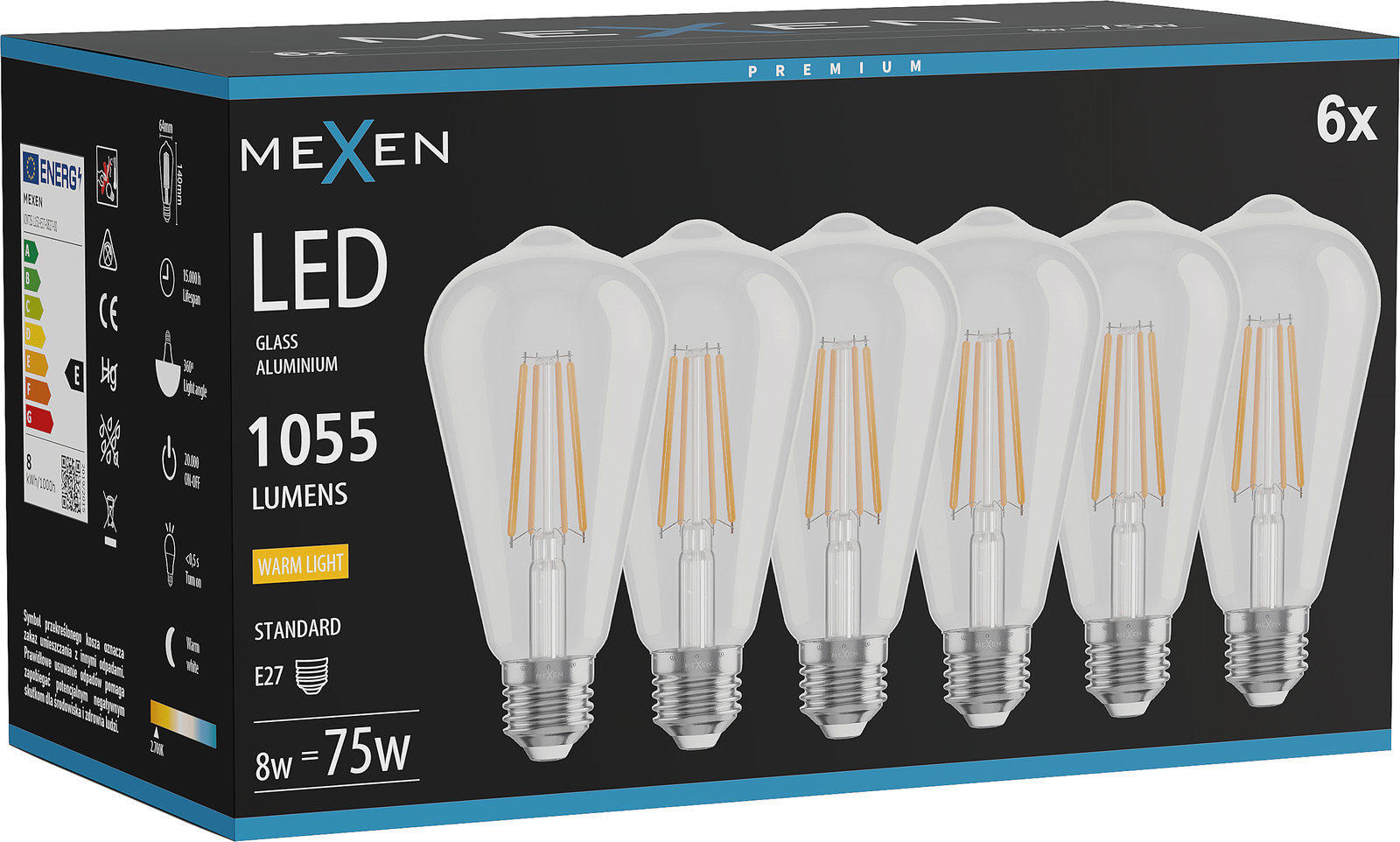 Mexen Vintis 6x LED Filament Bulb E27, ST64, 8W, Warm - 2700K, 1055 lm, clear - L152-E27-0827-00x06