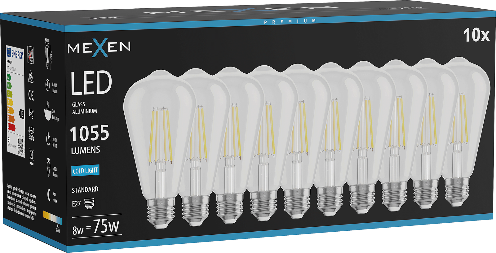 Mexen Vintis 10x LED filament bulb E27, ST64, 8W, Cool - 6500K, 1055 lm, clear - L152-E27-0865-00x10