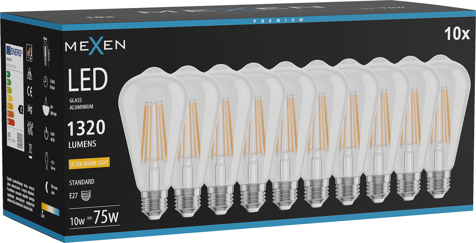 Mexen Vintis 10x LED Filament Bulb E27, ST64, 10W, Warm - 2200K, 1320 lm, clear - L152-E27-1022-00x10