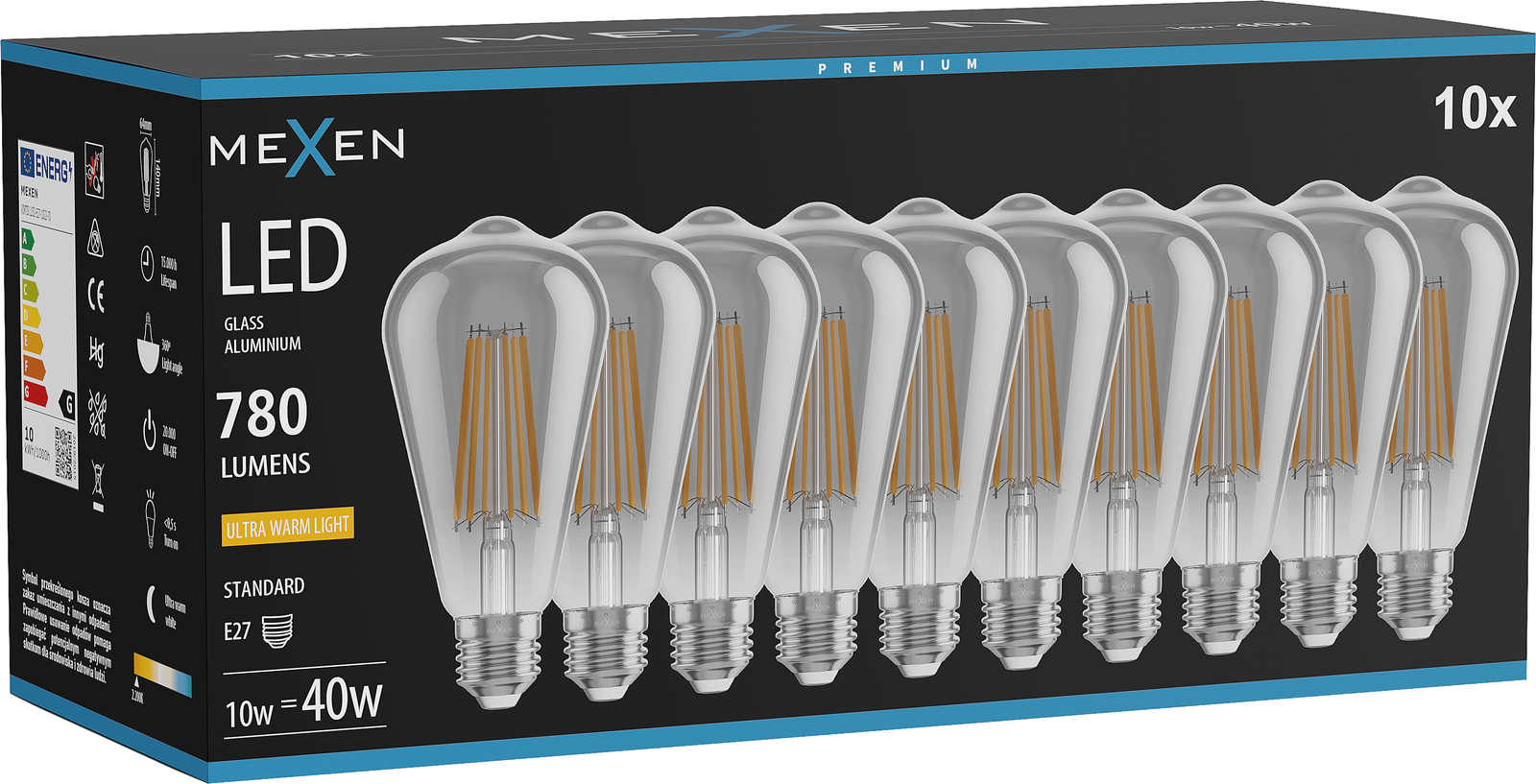 Mexen Vintis 10x LED Filament Bulb E27, ST64, 10W, Warm - 2200K, 780 lm, smoke - L152-E27-1022-70x10